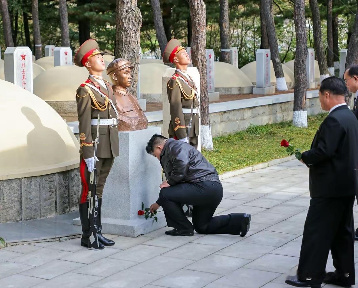 好样的。中国人民志愿军出国作战75周年之际,在烈士塔的花篮前,金正恩肃立默哀,凭吊毛岸英墓时,他右腿单膝跪地,左腿呈九十度直角,左手撑在大腿上,随后将一朵鲜花放在墓前,那朵花叶绿花红,虽然看不出来学名,却满含着对烈士们的崇高敬意。 朝鲜首都平壤以东约100公里的山区,在一个150米高的山腰上,就是桧仓中国人民志愿军烈士陵园,中国人民志愿军司令部曾驻扎在这里。志愿军的英勇形象永远被两国人民铭记在心,他们是英雄,是可爱的人,他们永垂不朽。