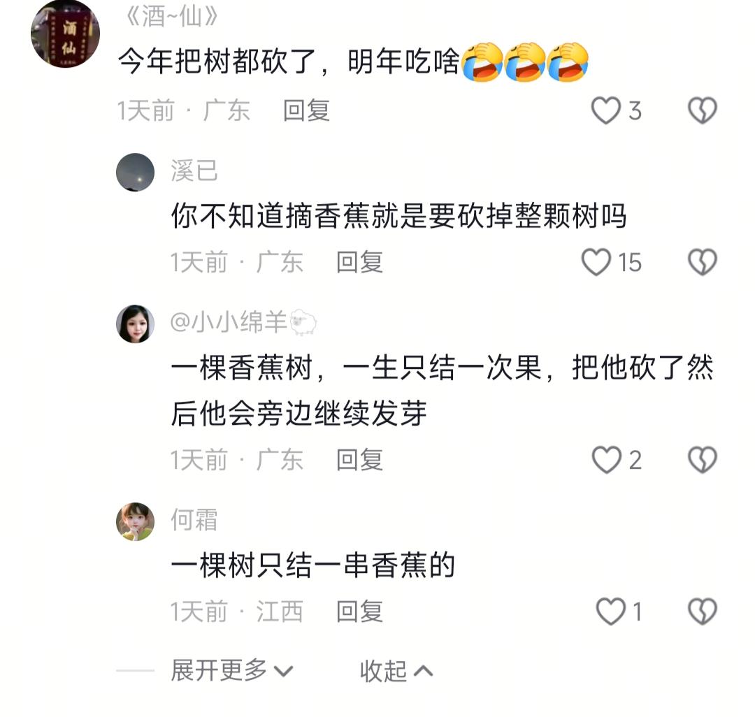 现在全网最后悔的女人就是农村小英子了吧! 不是因为拍视频没人看也不是因为带货没人买而是因为回广西老家砍了一棵外婆种的香蕉树给人说童年回忆是假的? 刷到农村英子回广西老家的视频时,我直接懵了——换作是我,外婆生前种的树别说砍,连片枯叶都舍不得碰,她倒好,看到外婆种的香蕉树勾起回忆,转头就喊表妹组队砍树!我当时心里直犯嘀咕:这回忆是假的?还是砍树有啥讲究?你是不是也跟我一样,看到这儿就想点进去看看究竟? 说实话,我外婆以前在院子里种过一棵桃树,每年结的桃子又小又酸,可我妈愣是舍不得砍,说那是外婆留的念想。后来桃树枯了,我妈还难过了好几天。对比英子,我本来想吐槽她“太狠心”,但看她视频里说“小时候外婆踩着板凳给我剥香蕉”,我又有点懂了——或许对她来说,吃到外婆种的香蕉,比光看着树更实在?但转念又想,砍了树明年咋办?这疑问我到现在还没完全想通。 英子把砍树摘蕉的过程发了视频,结果评论区直接炸了,各种声音都有,我和小伙伴都惊呆了!有人担心“今年砍了明年吃啥”,下面一堆人附和,结果立马有农业博主出来科普:“香蕉树结果后必须砍母株,不然吸芽长不起来,明年更没的吃!”我当时一拍大腿:“哎呀妈呀,原来还有这说法!”之前真是瞎操心了。 还有人吐槽“镰刀弯刀不用,拿洋船砍,能砍吗?”我晕,人家在农村,家里有啥工具用啥呗,难道还特意去买把镰刀?更离谱的是,居然有人追着问英子“裤子有没有链接”,这关注点也太偏了吧!说实话,我看视频时压根没注意裤子,光顾着看那串青香蕉了——那么青,得放多久才能吃啊?后来想想,可能大家看视频的重点本来就不一样,随便吧,开心就好。 本来我觉得英子就是单纯想吃外婆种的香蕉,结果刷到有人说“她就是借外婆的名头博流量!”理由是视频只拍了砍树摘蕉,没拍处理树桩。不是吧?拍视频还得把每一步都拍出来?这也太苛刻了吧!我之前发朋友圈晒外婆的旧围巾,还有人评论“留着占地方”呢,当时我特郁闷,后来想通了:自己觉得有意义就行,别人咋说管不着。 之前听人说“念想不用攥着东西不放,心里记着才最实在”,我当时还觉得是胡扯,直到看英子这事儿。其实啊,不管是砍树吃香蕉,还是留着旧围巾,只要心里有亲人的影子,咋做都对。那些站在道德高地指责英子“不孝顺”的,是不是有点越界了?人家自家的树,想咋处置咋处置,凭啥要被陌生人说教?这事儿想起来就觉得荒谬。 看完英子这事儿,我想跟你说句实在的——要是你手里也有亲人留的东西,别管别人说“占地方”还是“没用”,你想留就留,想用就用,念想这东西,自己舒服最重要。比如我现在把外婆的旧蒲扇放在书架上,偶尔扇扇风,就像她还在身边似的,这就够了! 总之,英子砍树是正确的,所以世人确实不懂得怎样种香蕉,所以有事情都是先搞清楚再说,你说是吧?农村小英子