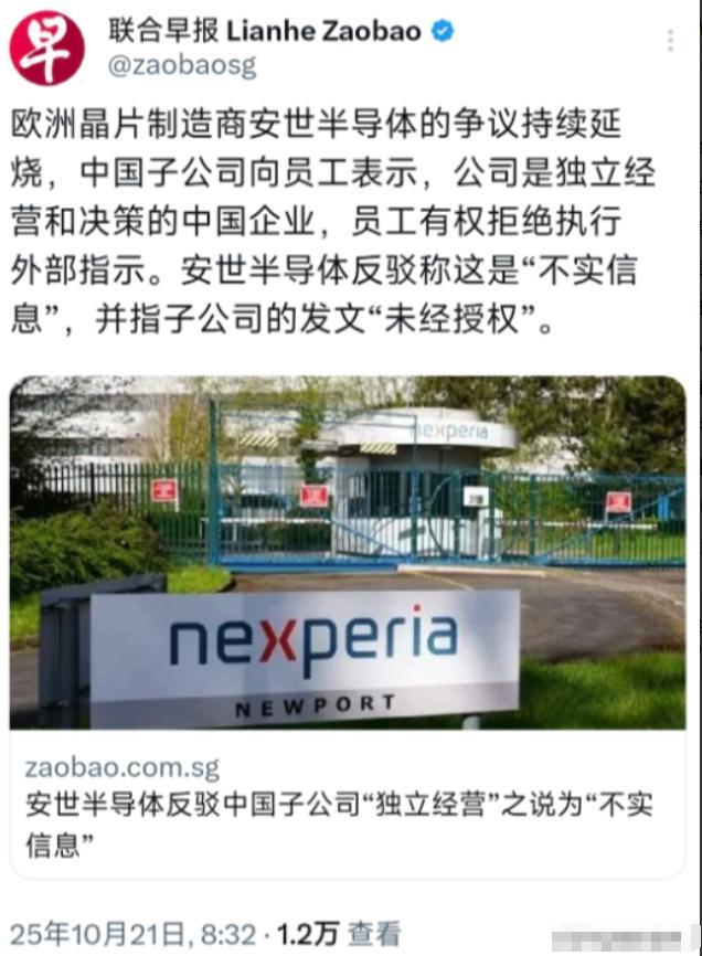 新加坡联合早报的报道:安世半导体中国子公司刚宣称“独立经营能拒外部指示”,就被荷兰总部说是“未经授权”。 安世半导体这场风波,早就不是什么公司内斗了,它活脱脱是一出现代寓言,讲的是在地缘政治的大锤下,一家跨国公司的“合法身份”和“实际控制权”是怎么被硬生生撕裂的。 荷兰总部和中国子公司都觉得自己有理,各自挥舞着法律的大旗,结果却指向了完全相反的方向。 这家半导体巨头就这么被劈成了两半,陷入了一场谁也说服不了谁的对峙。这背后,其实就是一张纸上的所有权,和工厂里实实在在的生产力,在进行终极掰手腕。 整场危机的开端,就是一场关于“到底该听谁的”的战争。荷兰总部拿着阿姆斯特丹法庭的判决,利落地暂停了中资背景CEO张学政的职务,还公开说中国子公司的声明“未经授权”。他们想从法律的制高点上,保住自己的发号施令权。 但这张来自欧洲的命令,到了中国就撞上了一堵结结实实的法律墙。安世中国直接甩出中国《公司法》,宣布自己是“独立法人”。 一封公开信,直截了当地告诉员工,只用听本土管理层的,至于荷兰总部通过Outlook或者Teams发来的指令?要是没有中国法定代表人点头,那就当没看见。 总部的免职决定,在中国子公司看来,跟废纸没什么两样。于是,公司内部冒出了两个互不搭理的指挥中心,一个靠股权说话,一个靠地方法规和生产实体撑腰。员工们彻底懵了,夹在中间不知所措,一个统一的安世,已经名存实亡。 这场内部权力的分裂,背后其实是各国政府在拿法律当武器互相角力。安世已经沦为了美国、荷兰、中国三方角逐的“代理人战场”。 扳机是美国扣下的,9月29日生效的“穿透规则”像一颗炸弹,直接威胁到了母公司在实体清单上的安世。在此之前,华盛顿就已经在向荷兰吹风,要求换掉CEO。 荷兰政府的反应快得惊人。9月30日,他们居然翻出了一部冷战时期的《物资供应法》,理由是“治理缺陷威胁欧洲供应链安全”,直接冻结了安世全球的资产调整。这个举动,明面上是为了国家安全,但谁都看得出它呼应了什么。 中国的反击来得也很快。10月4日,中国商务部启动出口管制,一招就锁住了安世位于东莞的关键仓库。这一下直接打在了命脉上,为通用和福特汽车供货的德国汉堡工厂,库存瞬间告急。中国用行动证明了自己在全球供应链上的话语权有多重。 当法律上的所有权,和物理上的生产控制权彻底脱钩时,你才能看清到底谁更有力量。荷兰总部手里的牌,是股权、法院判决书,还有那个能稀释股权的方案,这些都是写在纸上的东西,看起来很厉害,但摸不着。 相比之下,安世中国打出的是一套“实体组合拳”。先把员工的工资和奖金全抓在自己手里,经济上彻底独立。 然后,果断换成人民币结算,建起一道金融防火墙。但他们手里最硬的王牌,是那个每年能生产700亿颗器件、占了全球15%市场的生产线。 就算总部那边限制了IT系统的权限,车间的订单照样能靠“手动跟进”跑起来。这个细节再清楚不过了:荷兰的法令能冻结股权,但冻不住东莞工厂的流水线; 美国的压力能换掉CEO,但换不掉全球汽车巨头对中国封装能力的依赖。安世的教训就是这么残酷,当全球化的美梦破碎后,谁能握住机器和厂房,谁才拥有最后的话语权。