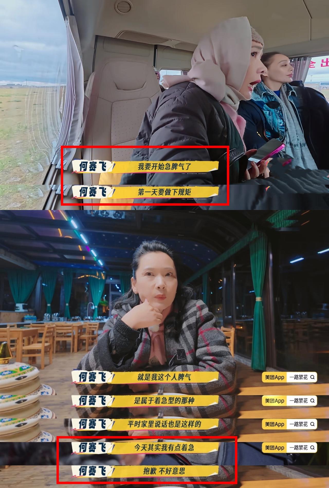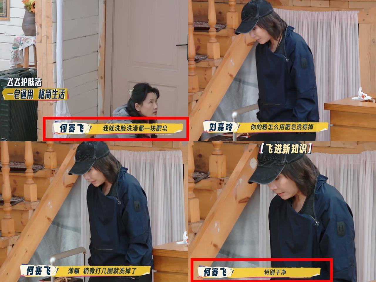 《一路繁花2》开播!刘晓庆退居二线,最有综艺效果的竟是何赛飞!没想到“杨九红”还有两副面孔! 一、精致女人也有“糙汉”一面。 5岁就开始做饭的何赛飞对吃食毫不马虎。不吃牛羊肉的她专门带了锅和调料,准备自行烹饪健康美食。餐桌上,她拿出自家做的虾皮,获得一致好评。 没想到这样一个精致女人,居然用肥皂卸妆!这可惊呆了刘嘉玲。 何赛飞继续补充,她洗脸洗澡只用一块肥皂,已经很多年了! 赛飞姐姐真是难得的朴实无华的女明星!这也说明,皮肤好不好关键在基因。谁叫咱们赛飞姐姐天生丽质呢! 很多网友联想到了同样用肥皂洗脸的张晚意。二人称得上忘年“皂友”了。 二、“变脸”比翻书还快! 旅行第一天,急脾气的何赛飞就发了两次火。 一次是因为嫌弟弟们磨叽,没按约定时间出发。一次是因为张柏芝作为导游没有把几天的行程统筹好。 不过,何赛飞很快就意识到自己的问题,主动道歉。她说,自己平时就是急脾气的人,请大家见谅,并夸赞了张柏芝的导游工作。 这样“知错能改”、真性情的赛飞姐姐还怪可爱的呢! 旅行期间,何赛飞还经常关心团友们冷不冷、累不累,妥妥的热心肠,只是有些“刀子嘴豆腐心”罢了。 看完《一路繁花2》第一期,大家最喜欢哪位姐姐或弟弟呢?