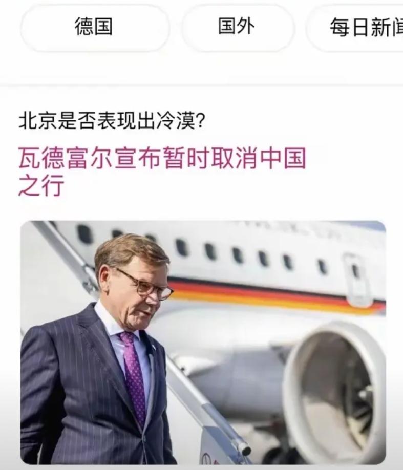 这回满意了吧?求人办事还要指手画脚。结果是:没人惜搭理你这丫的。 德国外长瓦德富尔此前已经宣布对中国三天访华。 但快要启程了,突然又宣布取消访华计划。 因为不取消也不行了,因为上飞机前还发表强硬言论,对中国指手画脚,还要给中国划红线。 声称台湾有事就是德国有事(这口气和日本如出一辙),还要求中国必须向德国放开稀土管制。 不知道的,以为这家伙身份比特朗普还特朗普,真不知道吃了几碗干饭。 结果,没人愿意见他!尴尬不?因此,取消访华是必然的。