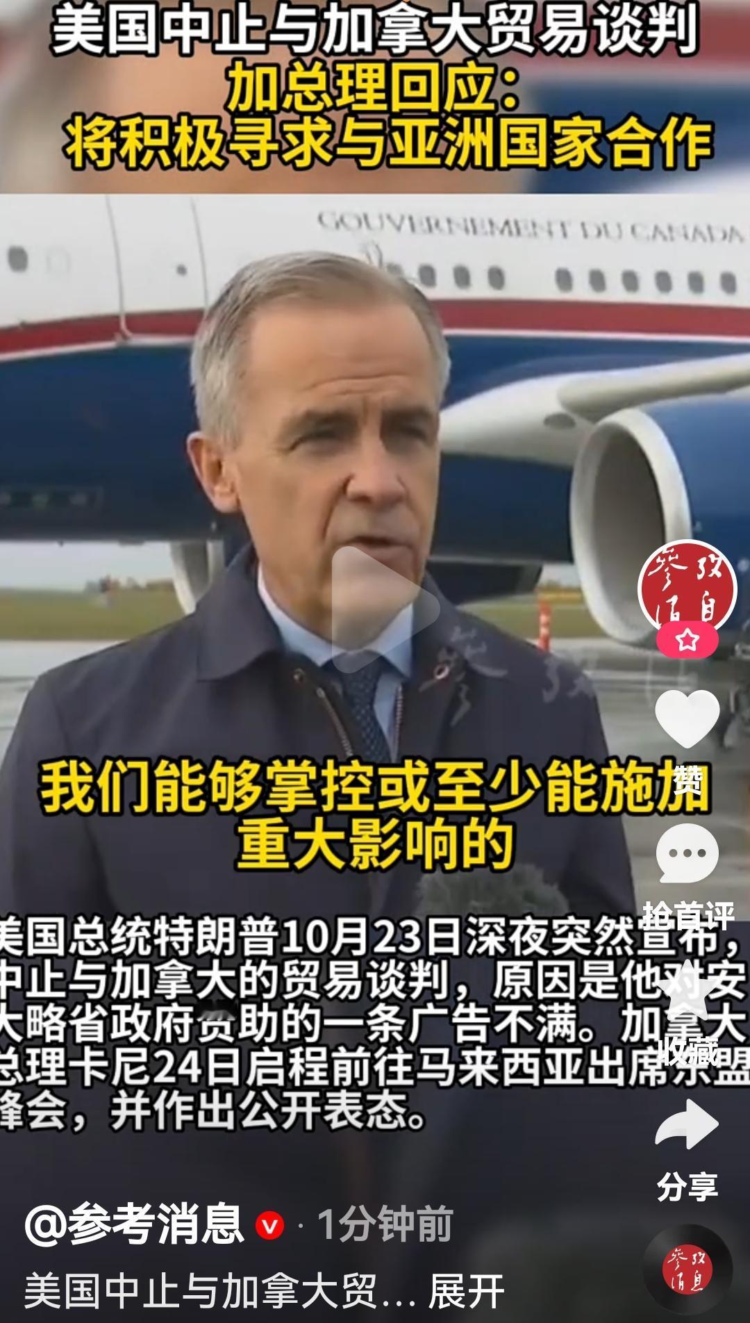 美国终止了和加拿大的贸易谈判,要闹翻吗 根据媒体报道,特朗普10月23日发文说中止和加拿大的贸易谈判,因为他对安大略省政府赞助的一条广告非常不满 加拿大总理卡尼将前往马来西亚出席东盟峰会,积极寻求和亚洲国家的合作 看来加拿大日子是不好过啊,作为美国盟友舒服那么多年了,现在估计是无计可施了,不得不到亚洲谈生意了加拿大对美关税 加拿大贸易纠纷 加拿大美国关系 加拿大贸易关系 图片来自参考消息视频