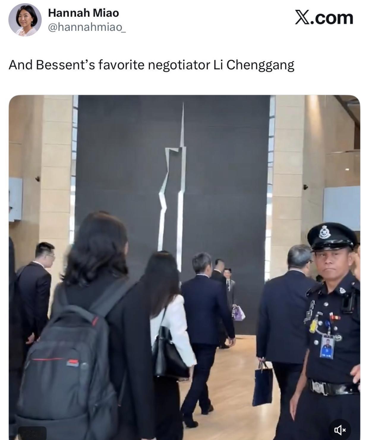 美国华尔街日报记者发文表示: “贝森特最喜欢的谈判代表李成钢抵达现场!” 地狱火警告!