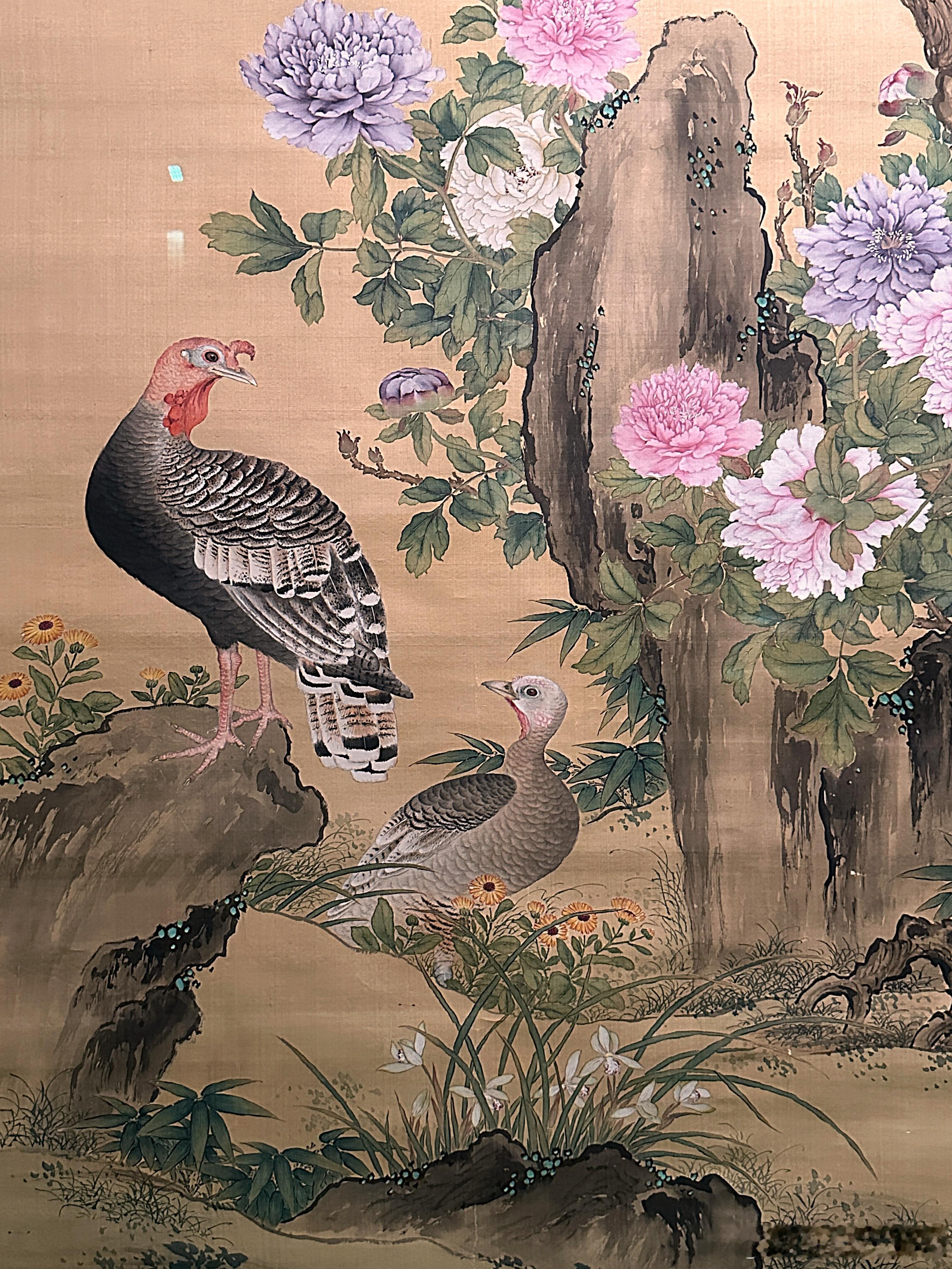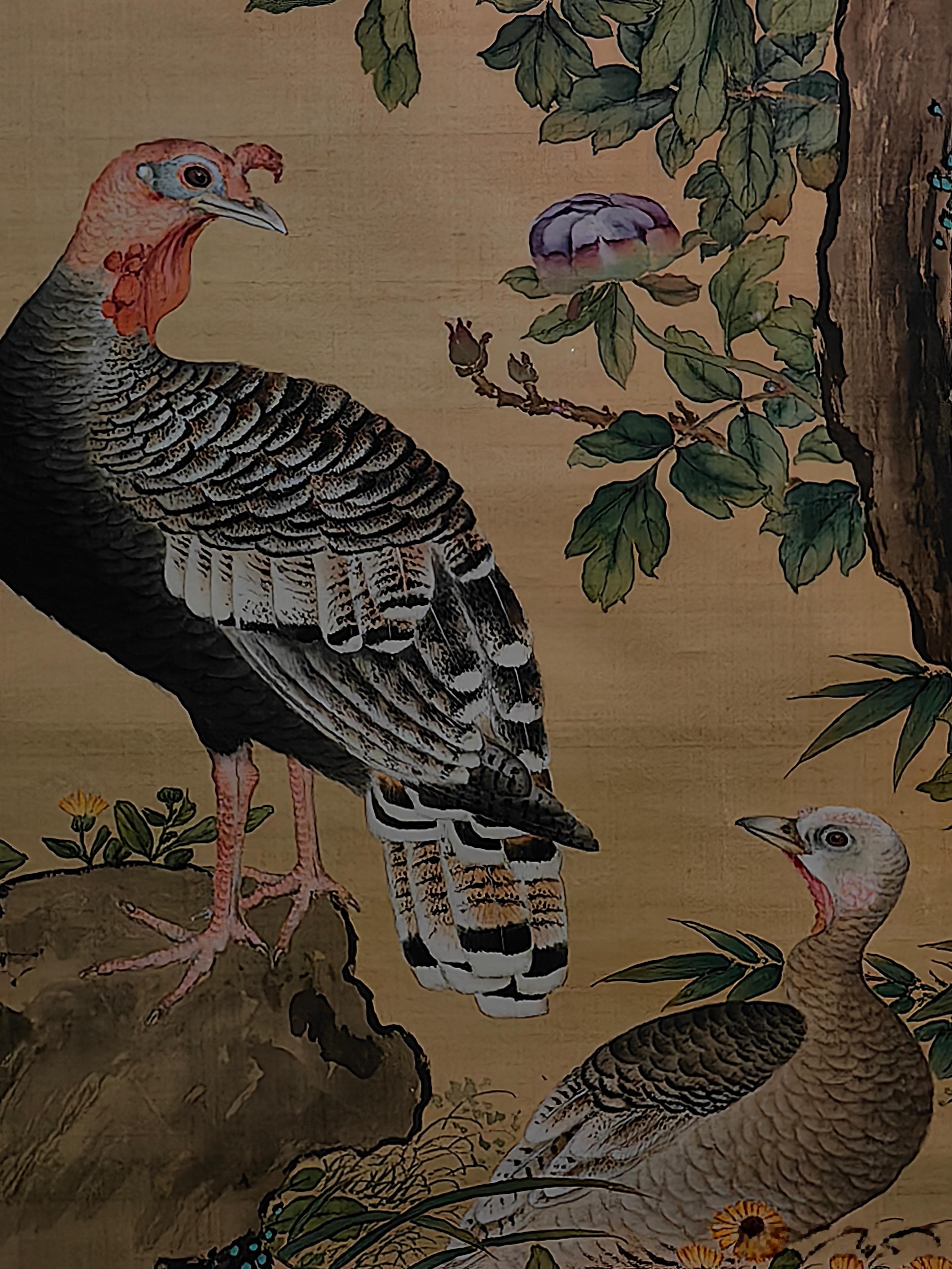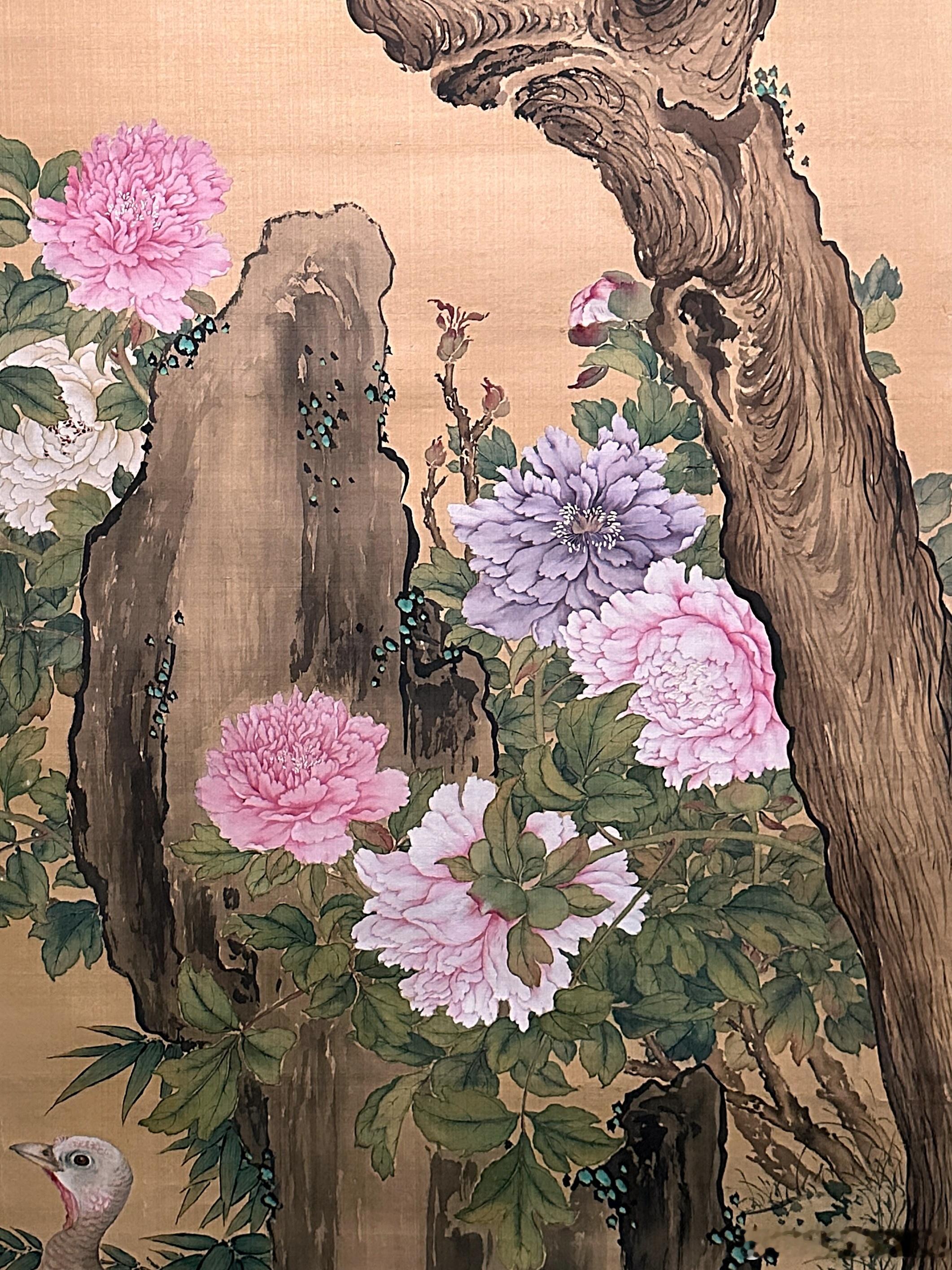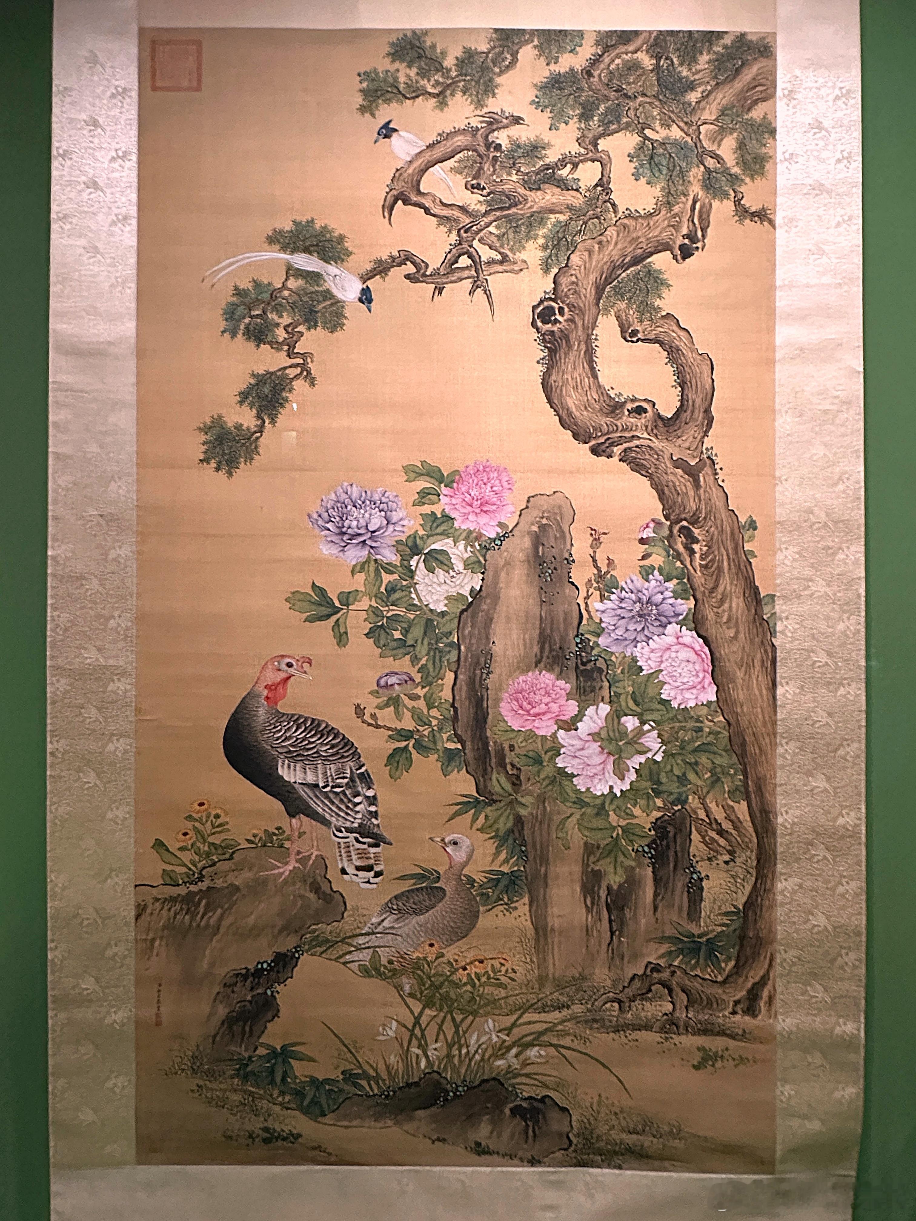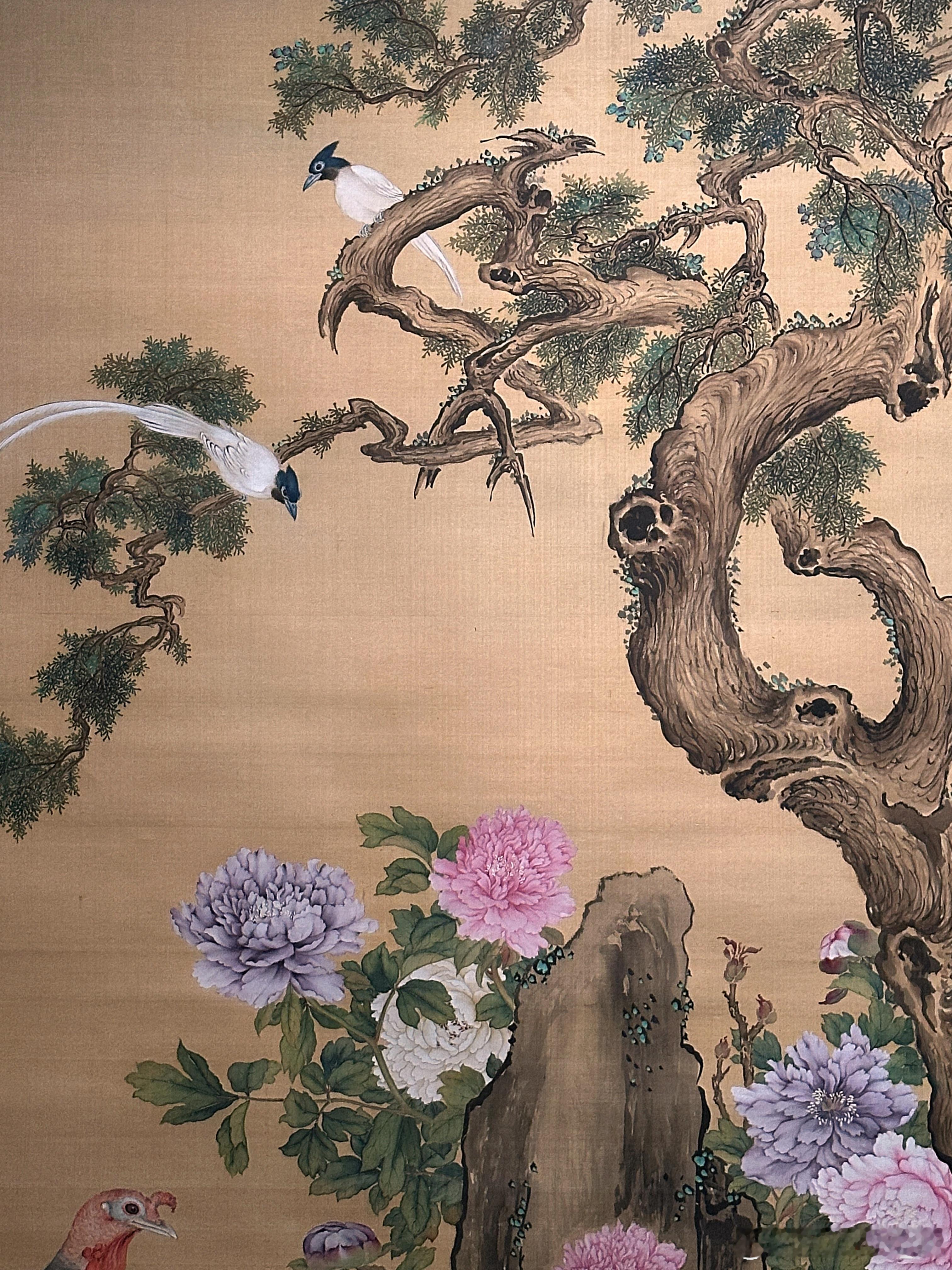 绢本设色画,画作纵 174.6 厘米,横 97.8 厘米。画面绘有牡丹、绶带鸟、吐绶鸡、柏、菊、兰、竹等吉寓之物。中部两株牡丹,粉者含露初绽,白者盛放雍容。成对绶带鸟栖于枝头,雄鸟两根长尾摇曳。吐绶鸡立于湖石旁顾盼左右,因“绶”与“寿”谐音,皆被视为长寿的象征。这些物象通过谐音或寓意,表达了 “富贵长寿”“富贵吉祥” 的愿望。本幅自题 “臣余省恭画”,钤 “臣余省” 朱白文、“恭画” 朱文二方印。左上钤 “乾隆御览之宝”,下钤 “宝蕴楼书画录” 鉴藏印。