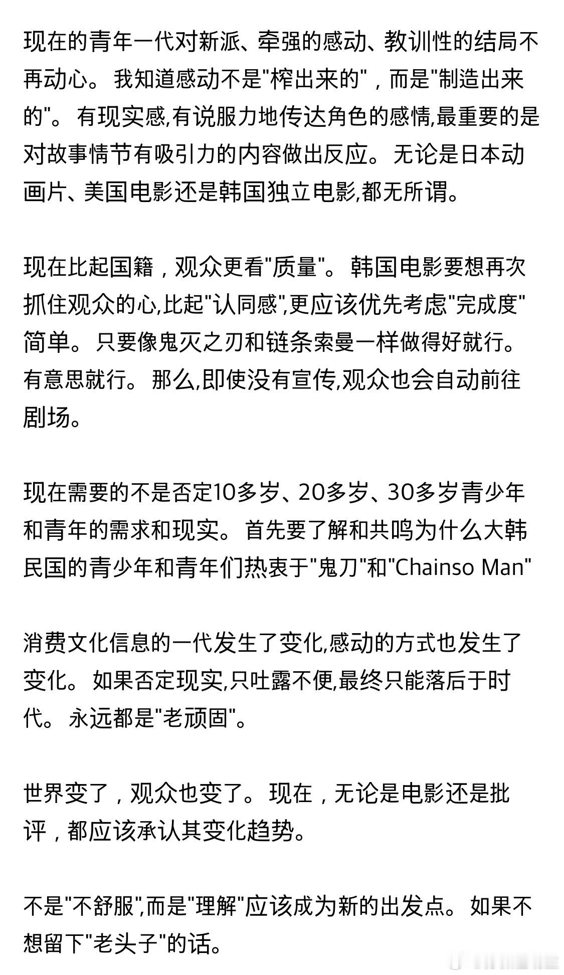 韩国电影若想重获观众青睐,需将“完成度”而非“身份认同”置于首位。
