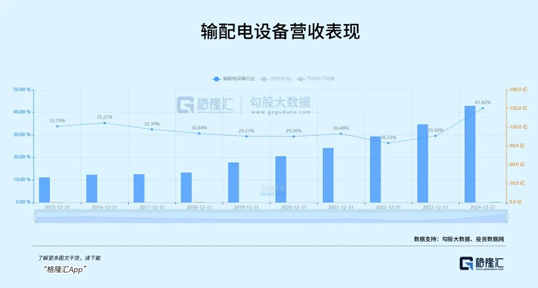 从营收结构来看,来自输配电设备的收入从2015年的39.76亿扩展至2024年的154.21亿,十年复合增速达到16.3%,近五年增速也达到了20.3%,属于稳扎稳打的增长步伐。经过技术研发逐渐向高端市场渗透,作为营收主力的开关、线圈类产品保持了较好的成长性,毛利率也比较稳定。