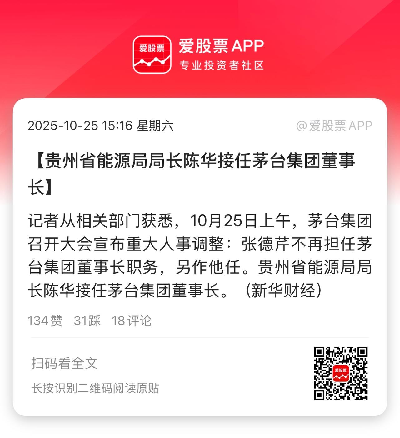 茅台又宣布换帅了,掌舵仅1年半的张德芹卸任董事长,贵州能源局局长陈华接任! 白酒板块萎靡了好久,茅台现在是遭嫌弃的老登,股价被小登寒武纪超越,市值被中登宁德时代超越。 股王的尊严被践踏,所以茅台急了。但这是不是病急乱投医呢?其实茅台的业绩没问题,消费弱也不是茅台自己能解决的,换帅也可能解决不了股价低迷的走势。 爱股君想说,茅台董事长位高权重,守住底线,不要再瞎折腾了。这才是最好的出路!