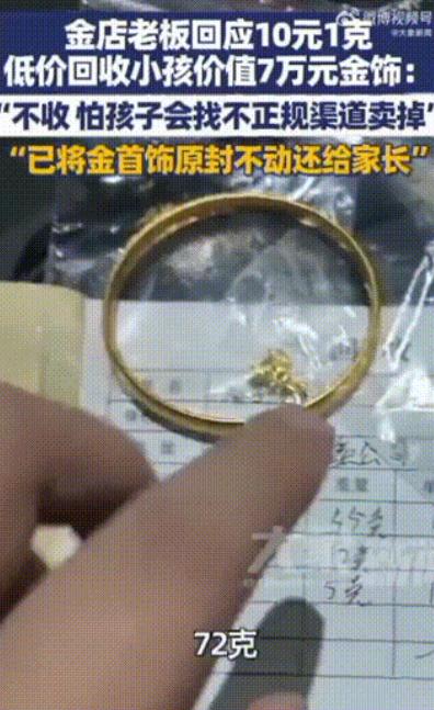 四川雅安一名男子以10元一克的价格,回收了一个孩子重达72克的金手镯,他给了这个