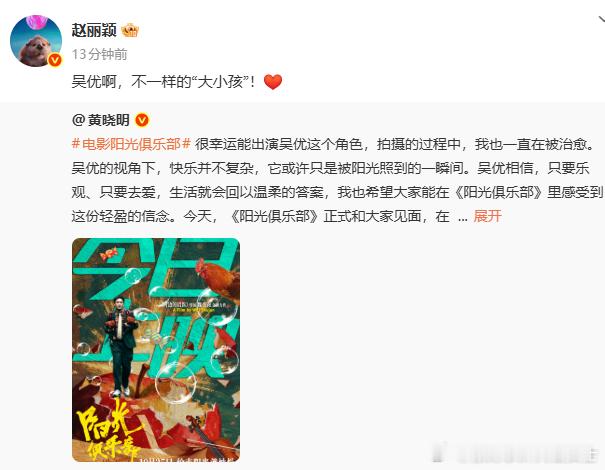 黄晓明回复赵丽颖黄晓明谢谢丽颖 10 月 25 日,赵丽颖帮宣黄晓明《阳光俱乐部》,从 “吴优” 切入,分享感悟并力荐影片。
