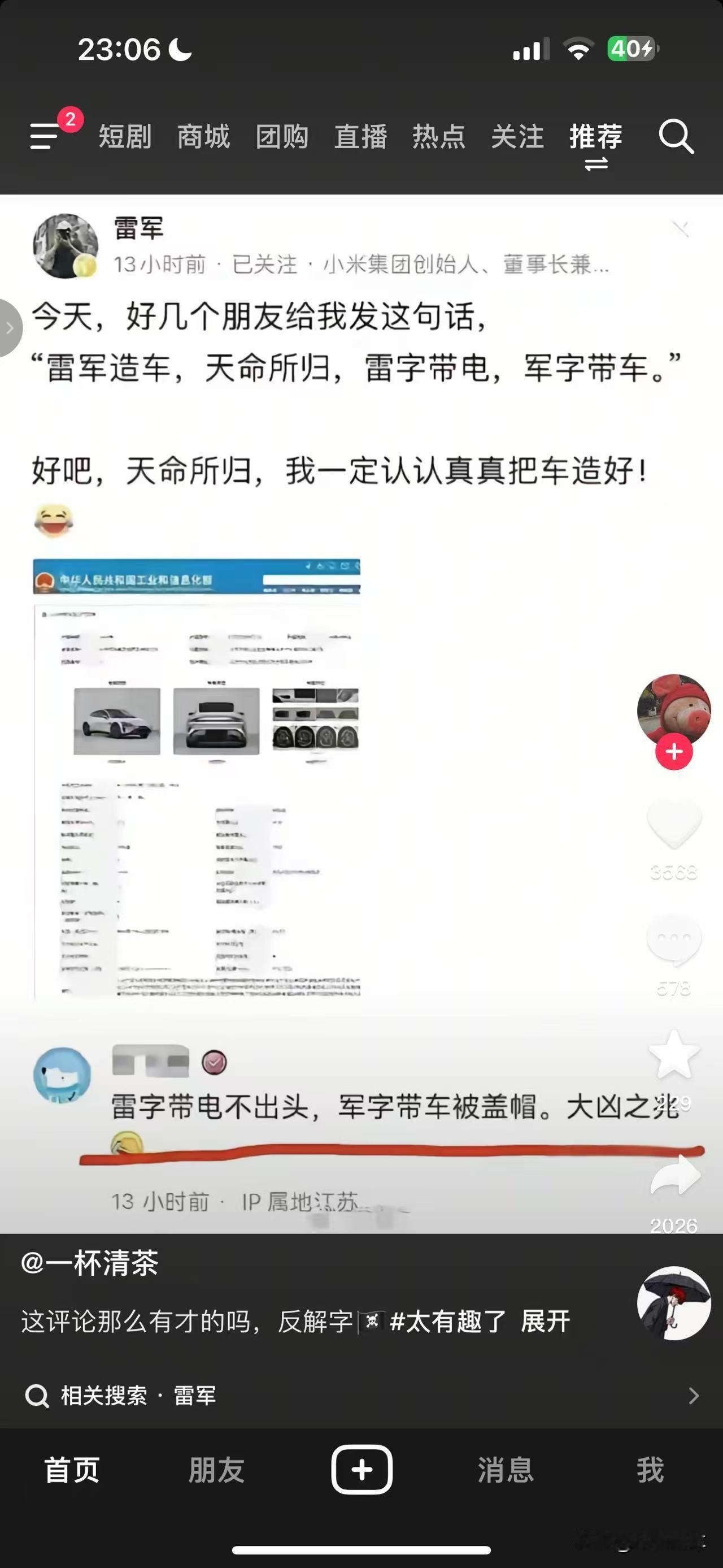 最近网上关于雷军造车出现了挺有意思的玄学解字。有人说“雷字带电、军字带车”,是天命造车;还有人反着解,说“雷字带电不出头,军字带车被盖帽”是大凶之兆。其实这些都是网友的趣味调侃,咱们看看乐呵乐呵就行。