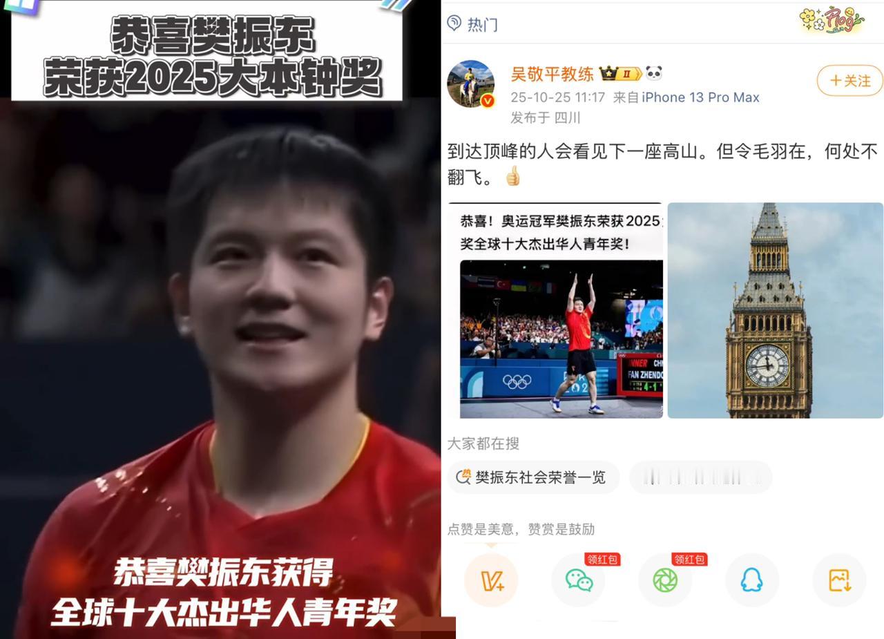 樊振东拿了“大本钟奖”, 吴敬平又在微博发文啦! 他徒弟那么多,却单单 为樊振东发声。为啥呀?就因为樊振东这人,人品优秀,实力更是杠杠的。吴敬平发文说:“到达顶峰的人,会看见下一座高山,但令毛羽在, 何处不翻飞。”意思就是樊振东乒乓球成就已登峰造极,可他能力出众,不管在哪干啥,都能出彩樊振东从十几岁就跟着吴敬平, 吴指导那是看着他长大,对他知根知底,打心底相信樊振东的人品和能力,所以总发文夸他。我觉得,这师徒情真让人羡慕。 大家说,樊振东以后还能创造啥新辉煌不?