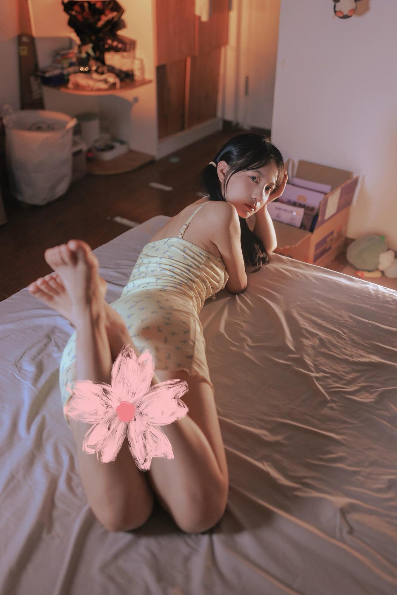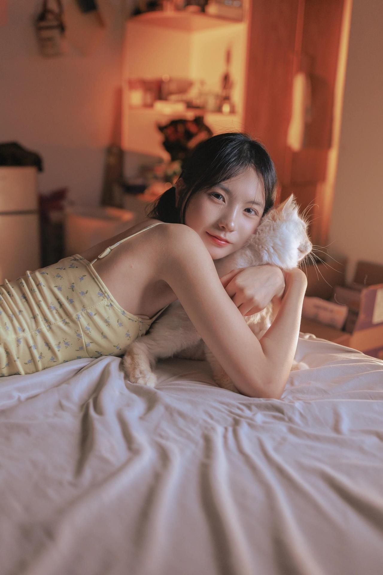 私房人像的思路,“生活感”体现在场景的真实与人物状态的松弛:未整理的床品、日常的家居陈设、与宠物的随性互动,这些元素让画面充满了生活的烟火气;而“仪式感”则体现在摄影的创作意识中:精心设计的光线、考究的服饰搭配(淡黄色碎花裙的清新感)、以及对人物姿态与情绪的引导,这些创作手法让“生活瞬间”升华为具有审美价值的摄影作品。 这种共生关系的营造,关键在于对“度”的把握:既不能让场景杂乱到失去美感,也不能让布置过度精致而失去真实。作品中,背景的家居物件虽多,但色彩与色调统一在暖棕与柔黄的体系中,形成视觉上的和谐;人物的穿搭虽有“写真感”,但碎花与吊带的设计又贴合居家的松弛氛围。最终,这种“生活感”与“仪式感”的平衡,让私房人像不再局限于“私密空间的人像记录”,而是成为一种“对日常诗意的审美提炼”,赋予了私房摄影更丰富的创作维度。
