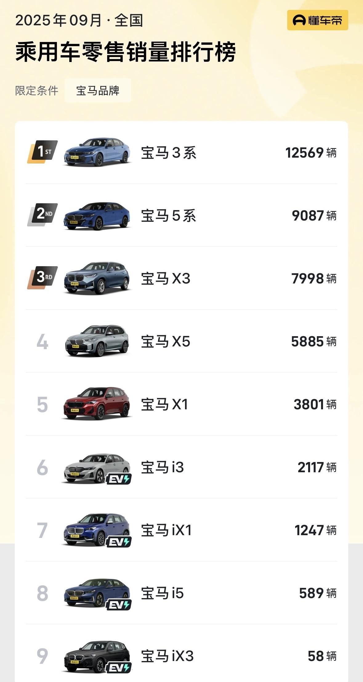 宝马9月各车型销量如下👇🏻 1、3系——9月销量12569辆 2、5系——9月销量9087辆 3、X3——9月销量7998辆 4、X5——9月销量5885辆 5、X1——9月销量3801辆 6、i3——9月销量2117辆 7、iX1——9月销量1247辆 8、i5——9月销量589辆