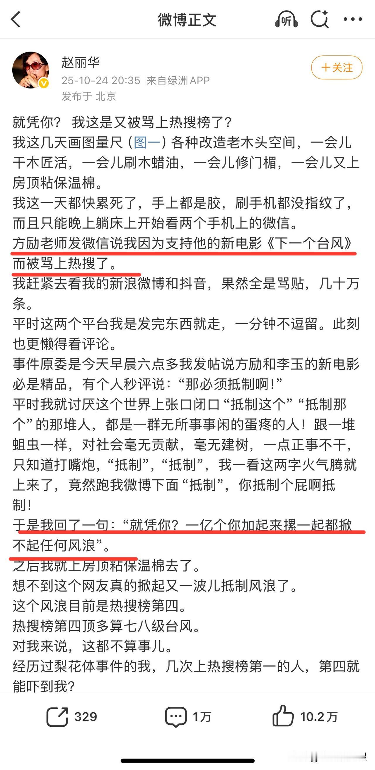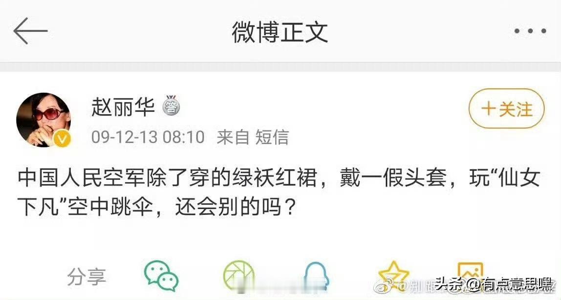 《下一个台风》越刮越歪,支持的这都啥人啊 按说,只是按说啊,应该是一部正能量的片子,咱没看,不对影片本身评论。 本来你踏踏实实上映,正正当当的宣传没啥问题,不知发行方搭错了哪根神经,先是请来舆论风评一边倒差评的崔某丽,结果大家恨屋及乌,影片还未上映就被一片抵制声淹没。 结果你们不痛定思痛,反而昏招迭出,又找来一个网评更差的重量级著名所谓女诗人作家赵丽华,这个女诗人一句“一亿个你这样的也掀不起任何风浪”,彻底把网民给激怒了。 这个赵丽华十几年前就看不起这个国家的人民,更看不起咱们的人民军队,曾经公开讽刺我人民空军“除了穿的绿袄红裙,戴一假头套,玩仙女下凡空中跳伞,还会别的吗?”,只不过2009年的网络没有现在这样发达,让她逃过了人民的审判,但,网络是有记忆的,出来混迟早要还的! 也可能我的理解与影片方有差距吧,人家没准儿认为,不管是被夸还是被骂,只要红了,热度起来了,就达到目的了吧 ————————