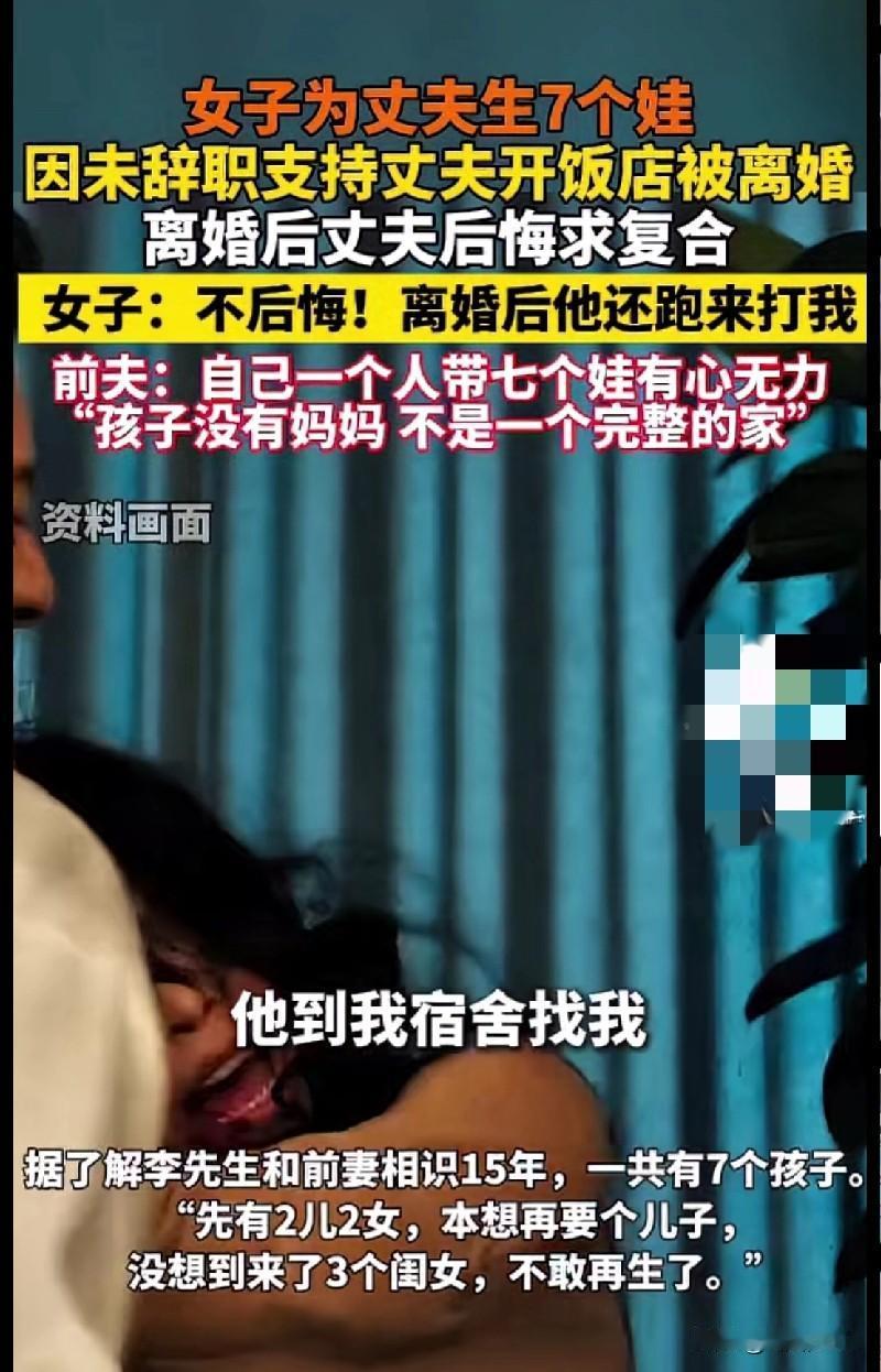 “家人们!这事儿也太离谱了!一女子跟丈夫过了15年,连生7个娃(2儿2女还追生3个闺女),就因为没辞职支持丈夫开饭店,直接被离婚了! 离婚后前夫倒后悔了,跑去找她求复合,居然还动手打人!女子硬气回怼:不后悔! 咱就说,这男的是把老婆当生育机器+免费劳动力了吧?生7个娃还得辞职支持他创业,离了又后悔,动手打人更是不能忍! 姐妹们,遇到这种拎不清的可得赶紧跑!你们觉得这女的做得对不?评论区快来唠唠!”