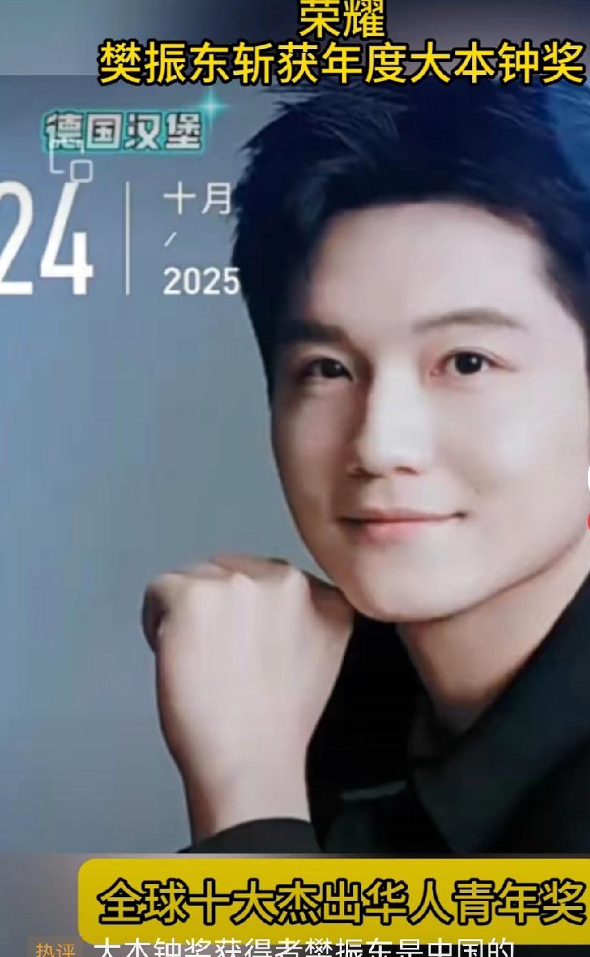 恭喜樊振东,斩获大本钟奖[赞][给力] 10月24日,大本钟奖颁奖典礼在德国汉堡举行,奥运冠军樊振东和林跃荣获2025年度大本钟奖全球十大杰出华人青年奖! 樊振东是继郎平、朱婷之后,第三个获此殊荣的中国人。 樊振东,用手中的球拍,书写了自己辉煌的奥运人生,也书写了世界乒乓球历史的传奇。 奥运之后,樊振东虽然很少参加世界比赛,转战德甲打球。 但是,失之东隅,收之桑榆。樊振东的优秀,被球迷看到,也被世界看到。 东哥获奖,再次证明:你只管努力,上天自有安排! 恭喜樊振东,恭喜林跃荣,你们是中国青年的楷模,祖国和人民的骄傲![给力][赞]