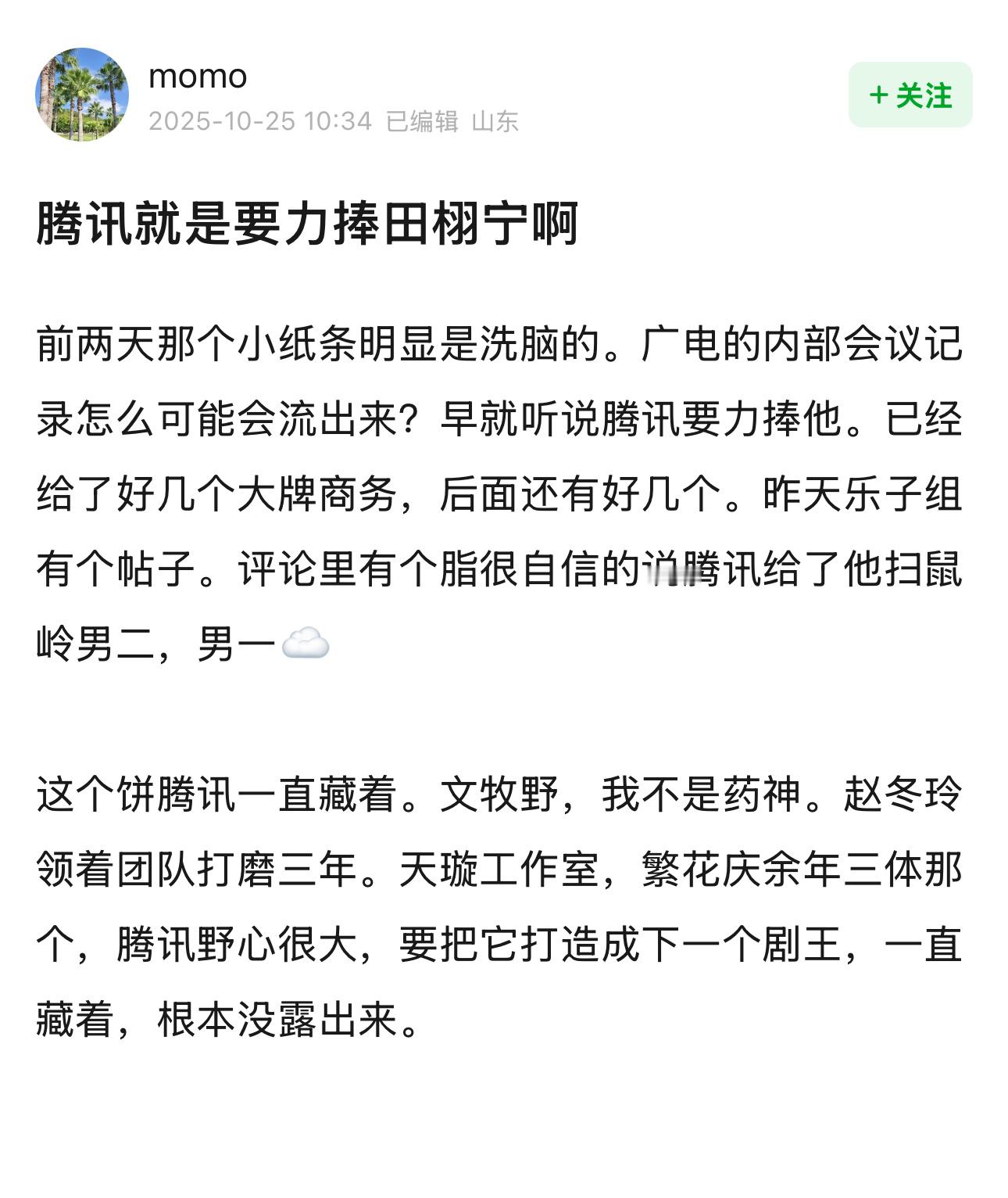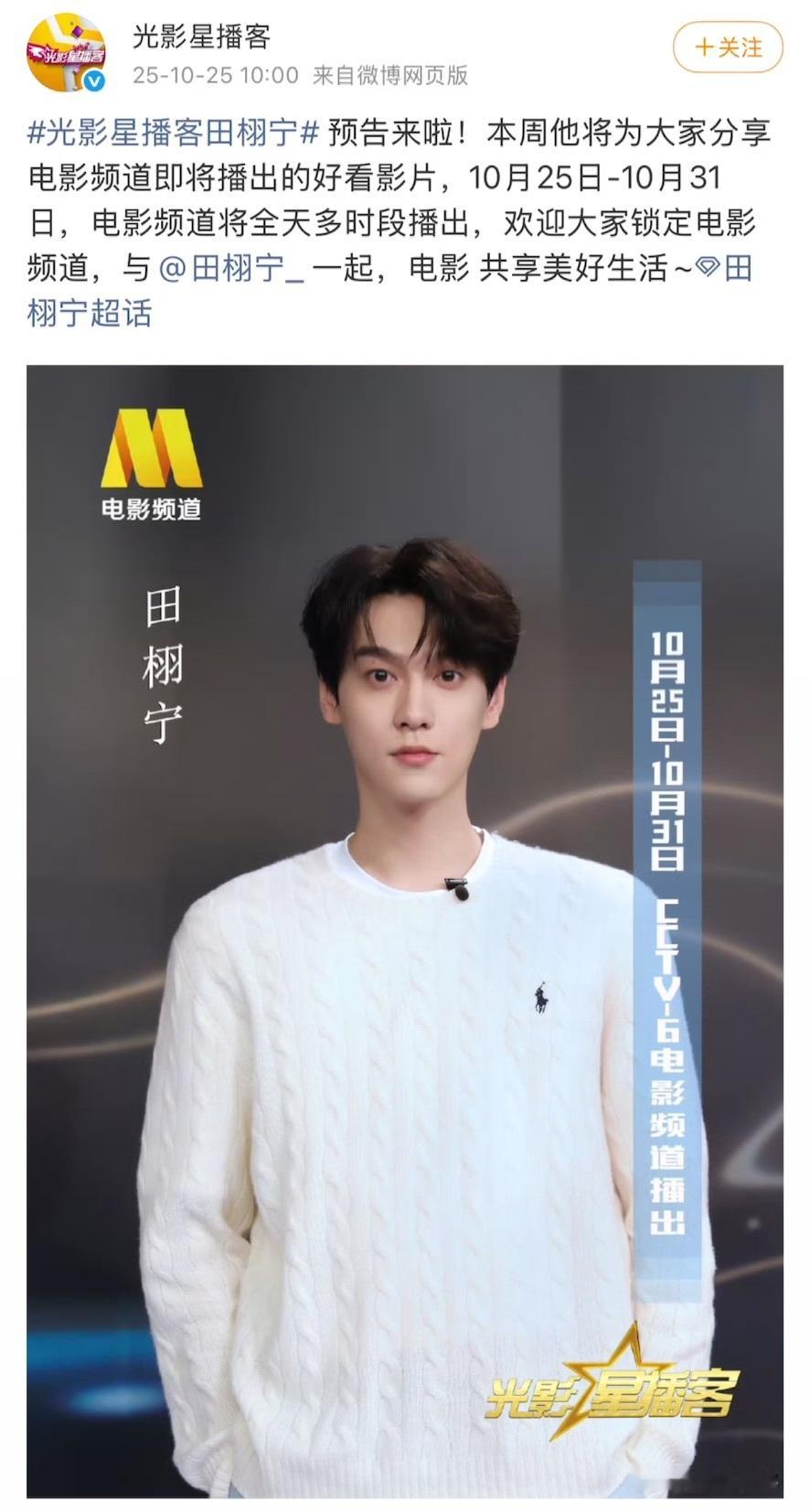 田栩宁登上了CCTV6张若昀田栩宁 扫鼠岭腾讯或将力捧田栩宁腾讯是不是要力捧田栩宁不知道,但华策肯定是要力捧田栩宁。上面三个热搜感觉是在为田栩宁即将官宣的新代言高梵预热,给粉丝画饼提振消费信心。[不愧是你]