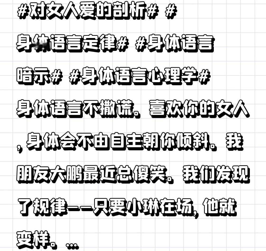 身体语言不撒谎。喜欢你的女人,身体会不由自主朝你倾斜。 我朋友大鹏最近总傻笑