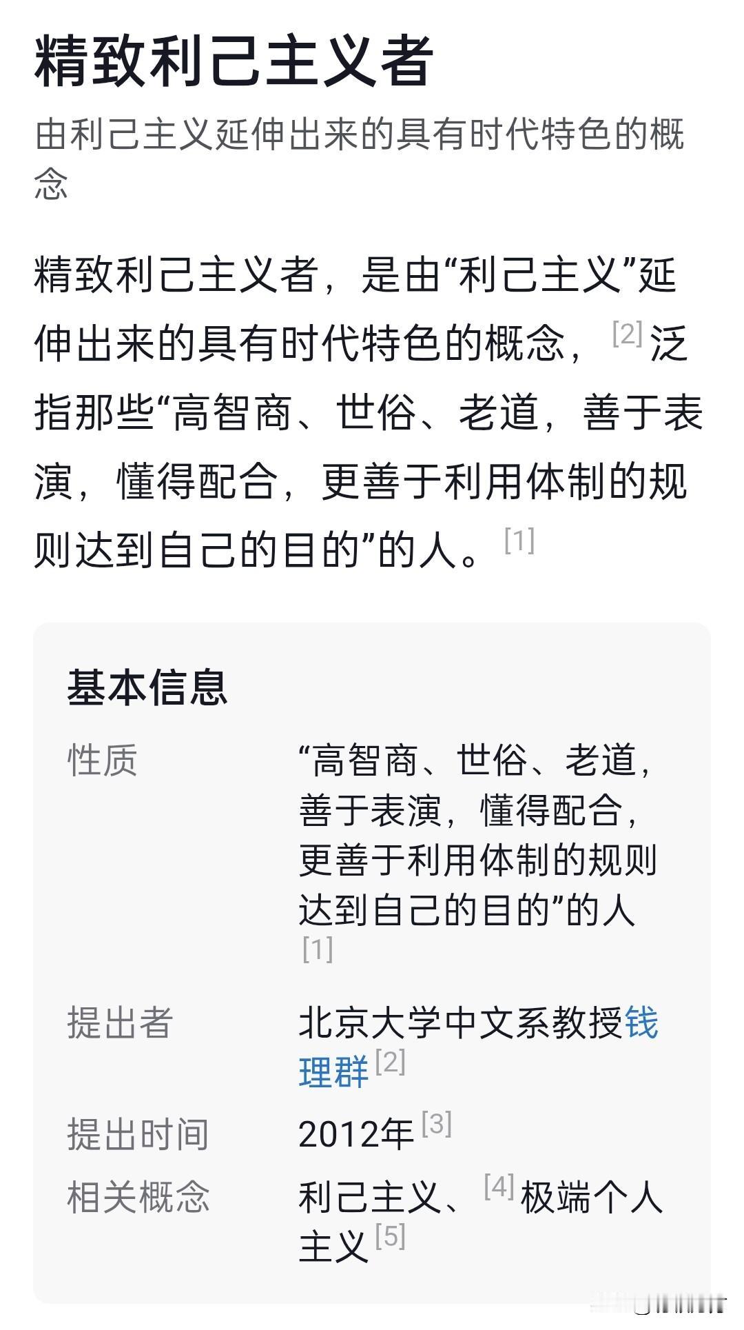 网络上经常有人说某人是“精致的利己主义者”,最近看到的被这样批评的人是张雪峰,因为他在一个月沉寂之后的复播中称文科生“大有可为”,与他之前的观点大相径庭。 那么什么是“精致的利己主义者”呢?这个说法最早的提出者是北大教授钱理群先生,指的是那些“高智商、世俗、老道,善于表演,懂得配合,更善于利用体制的规则达到自己的目的”的人。用这个标准来看张雪峰,那么大致是符合的,除了最后一点,张雪峰其实并没有从体制借用太大的助力。 但是,上述的标准除了“高智商”不容易满足之外,社会上小有成就的人大多可以套入,那么真有这么多的“精致利己者”?我觉得有点儿范围太宽了,我个人有个想法,利己是生物很正常的本性,很难切除,够不够“精致”主要是看他有没有意愿和能力去利用规则逃避责任。比如张雪峰作为一个商人,他的责任就是向客户提供真实有效的商品或服务,就此而言,他并没有设法逃避,因此也就算不上“精致的利己者”。您说呢?