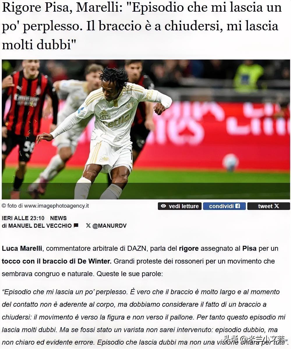 米兰的点球很牵强。前意甲裁判马雷利接受采访表示米兰与比萨之战中的点球判罚十分牵强。这个判罚让我有些困惑,的确,当时德温特的手臂张开,没有在接触足球的瞬间紧贴身体,但我们必须考虑球员正在把手臂回收的事实。 这是一次值得怀疑的判罚,但并非明显的错误。这个判罚令人疑惑,但没有给所有人一个清晰的判断。我不清楚这个球是不是点球,还是相同的话我们最近几年从球队到球员与球迷都习惯了这样的判罚方式,一百次误判有九十九次我们吃亏了,唯一得力一次恨不得二十四小时不间断的宣传,所以讨论裁判没意义,我还是觉得老比利说的对,十人米兰也有能力取得比赛胜利,我们永远关注比赛,我们有哪些地方没做好。 只有弱者才会反复去强调客观因素,米兰与米兰球迷不应当去考虑用这样的方式来表达内容,个人觉得阿莱格里真的是一位很好的教练,他在赛后采访表示的是我们对比赛的控制不够,事实是阿莱格里想控制,但米兰没有替补,我们没办法控制,但阿莱格里没有强调客观因素,他说的是自己做的不足的地方,这样的教练才有资格成为教练,这样的教练才能带领我们的小伙子们越来越好。