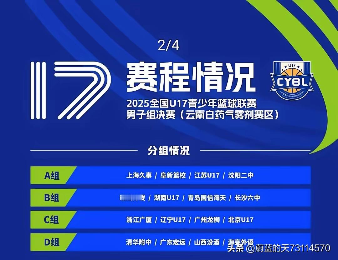 [玫瑰][玫瑰]2025年全国U17男篮联赛四分之一决赛战报: 一,四分之一决赛战报: 1,上海久事100-69大胜北京U17 2,广东宏远94-87战胜广州龙狮 3,浙江广厦95-64大胜海亮中学(浙江) 4,山西汾酒79-59战胜湖南U17 二,四强半决赛对阵情况(10月26日) 1,广东宏远-上海久事(15:00) 2,浙江广厦-山西汾酒(19:30分) 三,决赛对阵及预测: 1,三四名决赛:预测半决赛的负队(广东宏远vs山西汾酒) 2,冠亚军决赛:预测半决赛的胜队(浙江广厦vs上海久事)