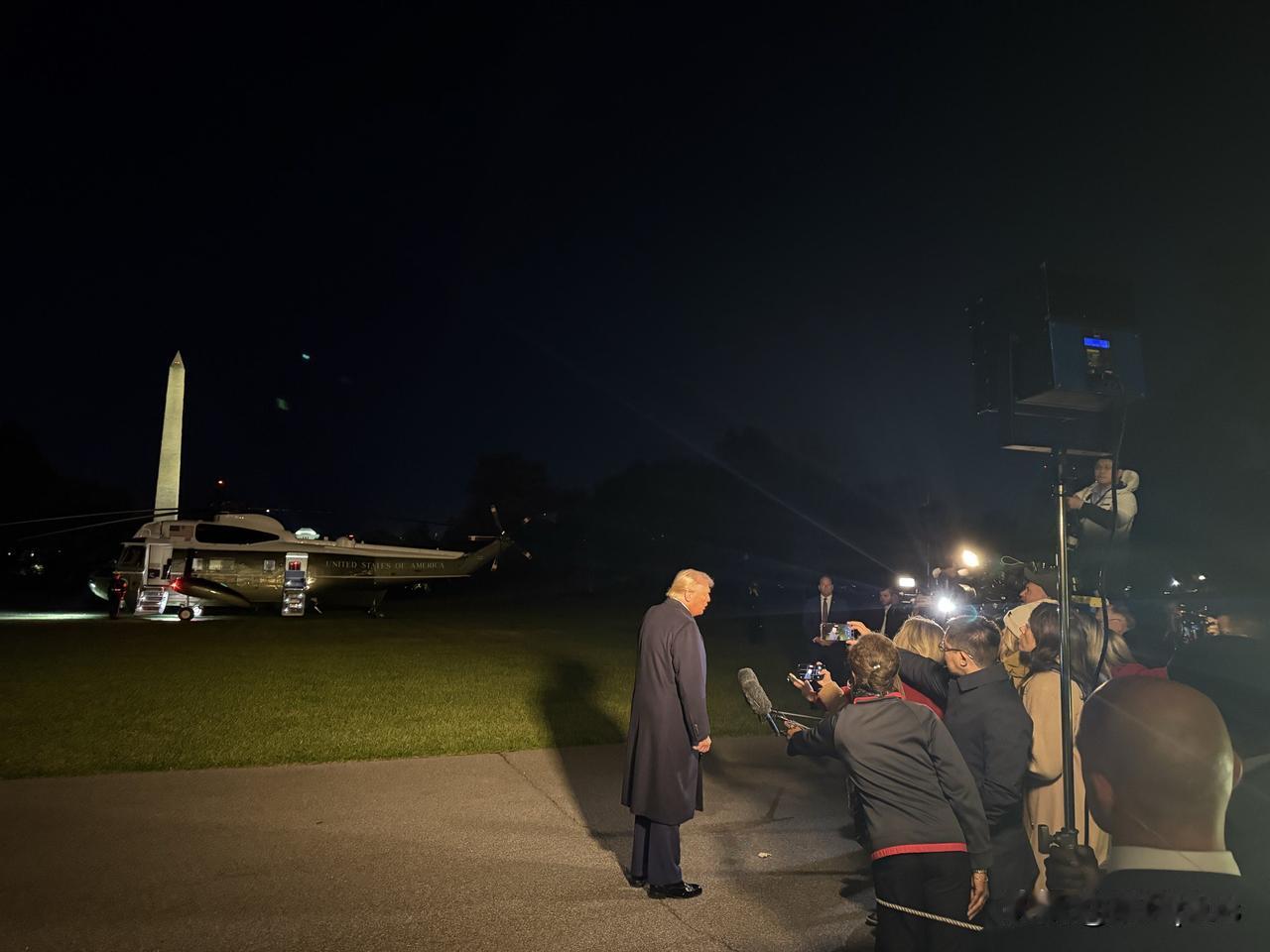 特朗普从白宫出发的画面,有一种帝国落幕的感觉。年近80岁的特朗普,在夜色中,等待乘坐直升机,他接受采访。 媒体打出的灯光,照亮了黑夜的一隅。在灯光中,特朗普的影子拉长,伸向远方。后面的直升机专机与方尖碑,在黑夜中闪着光亮。 这个画面里,快80岁的特朗普尽管身形依旧挺拔,但在夜色中难掩衰老的容貌。