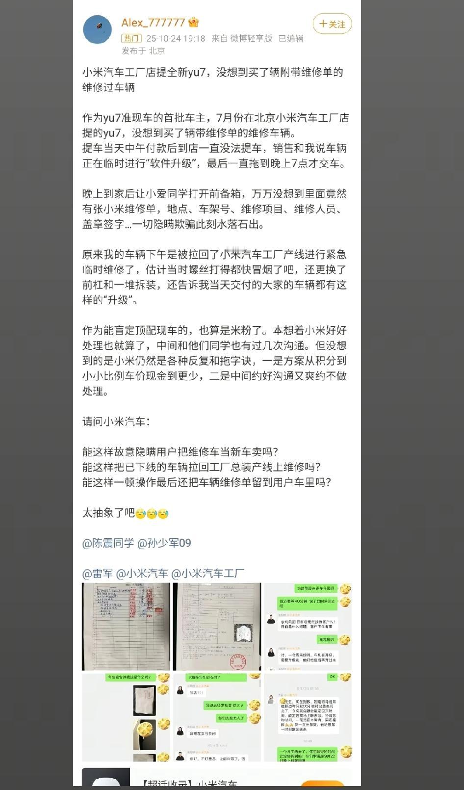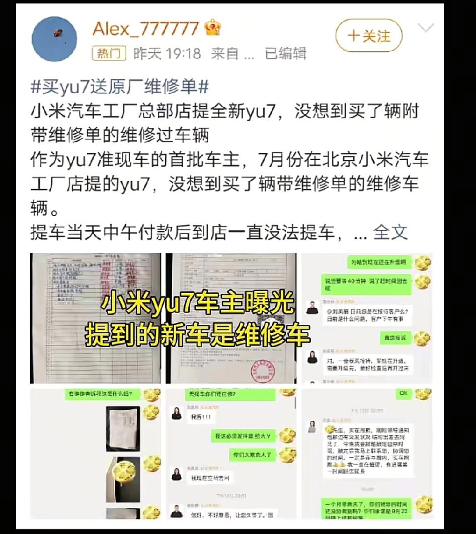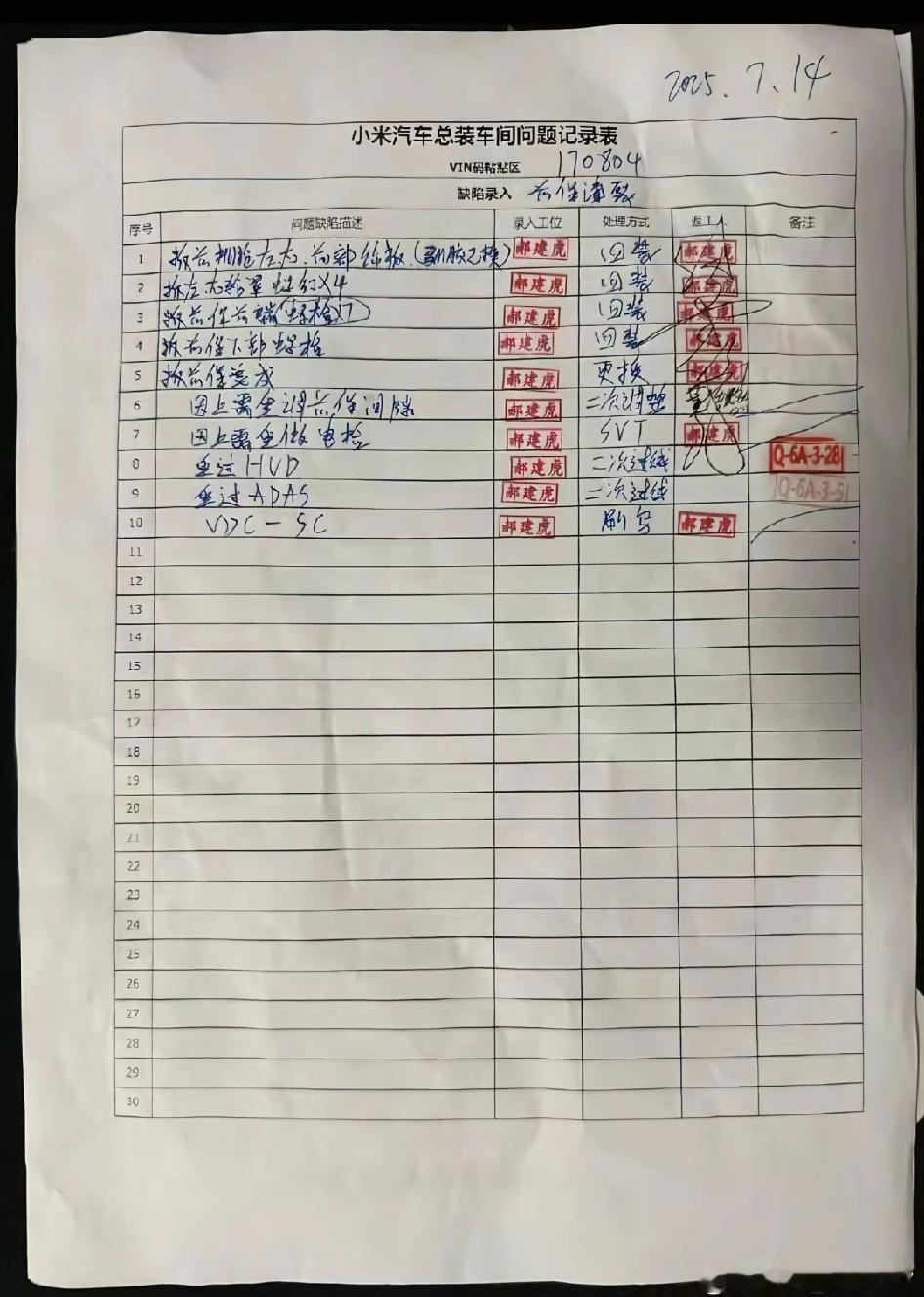 买yu7送原厂维修单! 有网友是这样评论的:这是总装出厂前的维修,维修完成后会重新上线检测,检测通过才会批准出厂。所有总装车间都有返修区,100台车至少20台会返修,返修后重新上线检测,达到出厂标准才会出厂。看来连懂车帝也这么不专业。这就是总装的随车装配维修工单,这只是其中一张,一个车生产出来有30多页。
