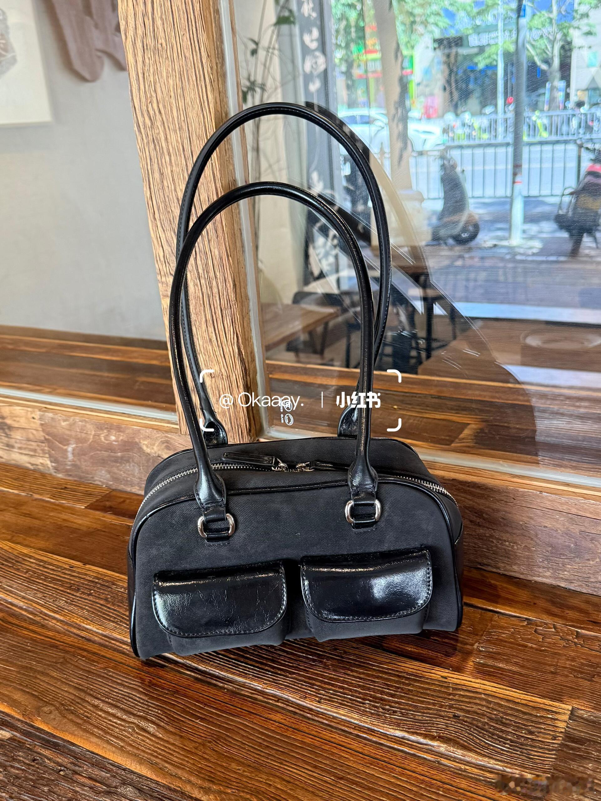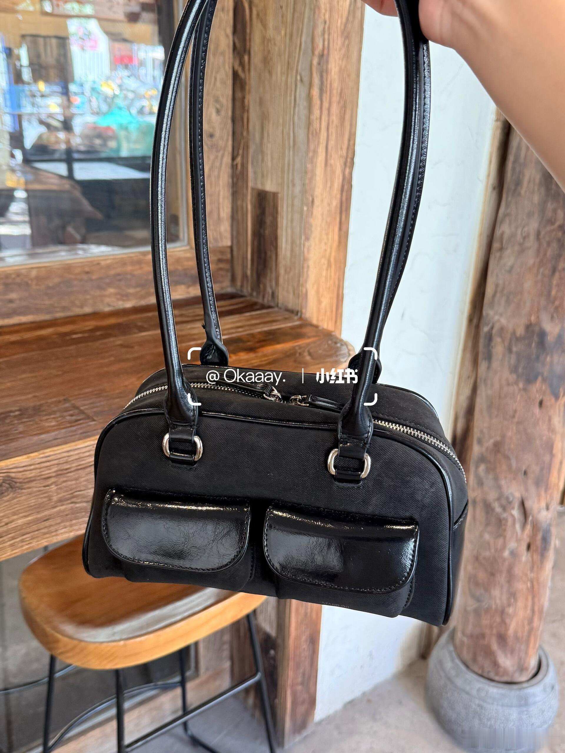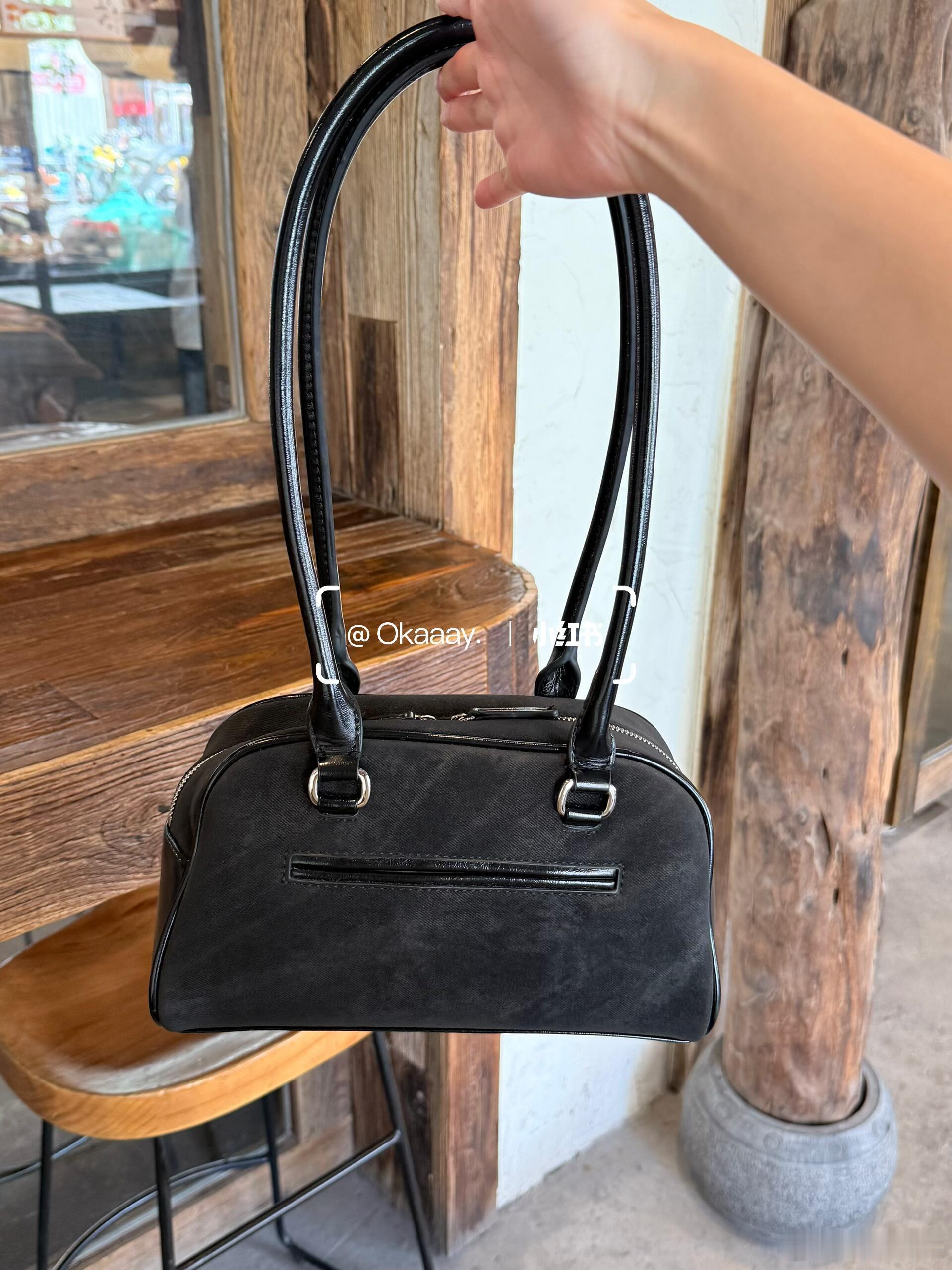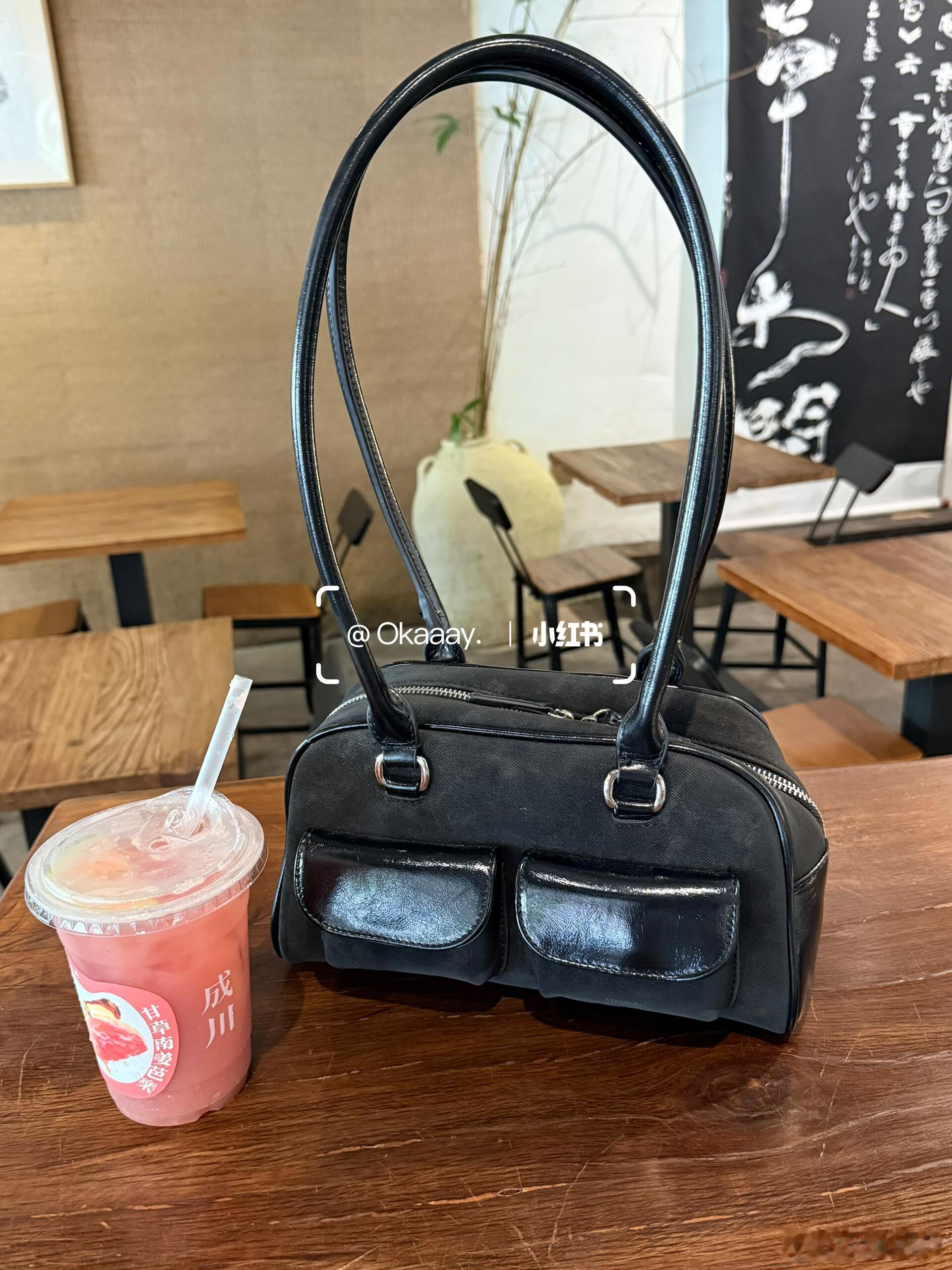 这款手提包是图中极具质感的时尚饰品。它以黑色优质皮革制成,廓形简约利落。包身正面的两个圆形银色金属扣口袋是设计亮点,兼具装饰性与实用性,其中一个口袋上压印的“STAND OIL”品牌标识增添了独特的工业风气息。一只手正优雅地提着它,浅粉色指甲油与包袋的酷黑形成巧妙对比,更衬托出皮具的高级质感。整体设计低调却不失个性,完美适配通勤与休闲等多种场合,是一款能瞬间提升整体造型格调的精致配饰。时尚配饰