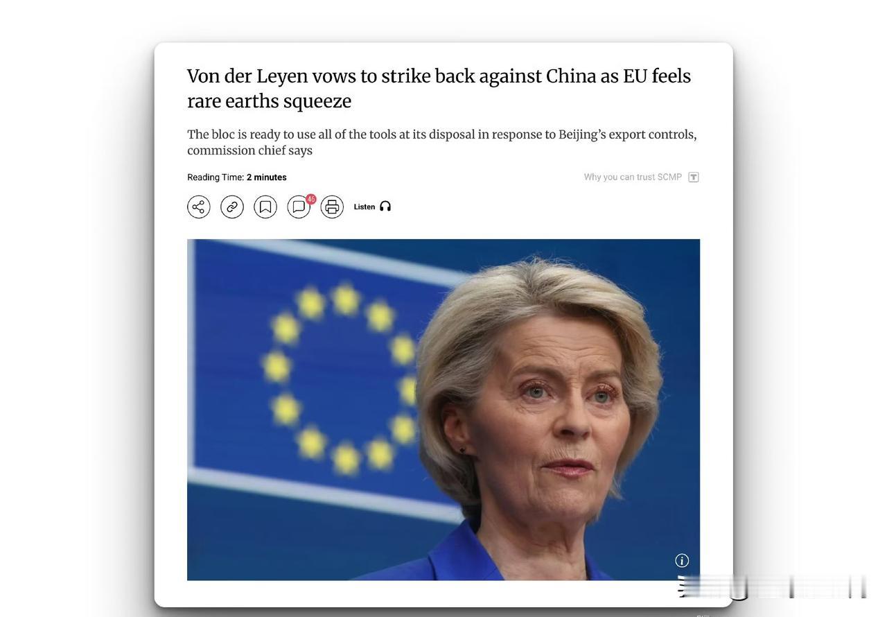 因稀土供应问题,欧盟委员会主席冯德莱恩誓言反击中国 欧盟委员会主席冯德莱恩周六在一次强硬讲话中表示,欧盟准备对中国稀土出口限制采取报复措施。 冯德莱恩在柏林全球对话会议上表示:“短期内,我们专注于与中国同行共同寻找解决方案。但我们已准备好在必要时动用所有工具来应对。我们将与七国集团伙伴合作,采取协调一致的应对措施。” 周四,法国总统埃马克龙敦促其他领导人启动对中国企业征收关税、配额、出口管制或市场禁令等报复手段。