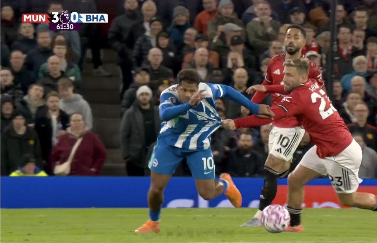 【英超名哨备受质疑】曼联vs布莱顿,上半时迪亚洛在禁区内被撞倒(视频:),主裁安东尼泰勒果断不罚点球。下半时,曼联的第3个进球,源自卢克肖在前场抢回球权,但是胖肖明显拉衣服在先,但是安东尼泰勒居然没判犯规,进球有效,这实在是太。。。