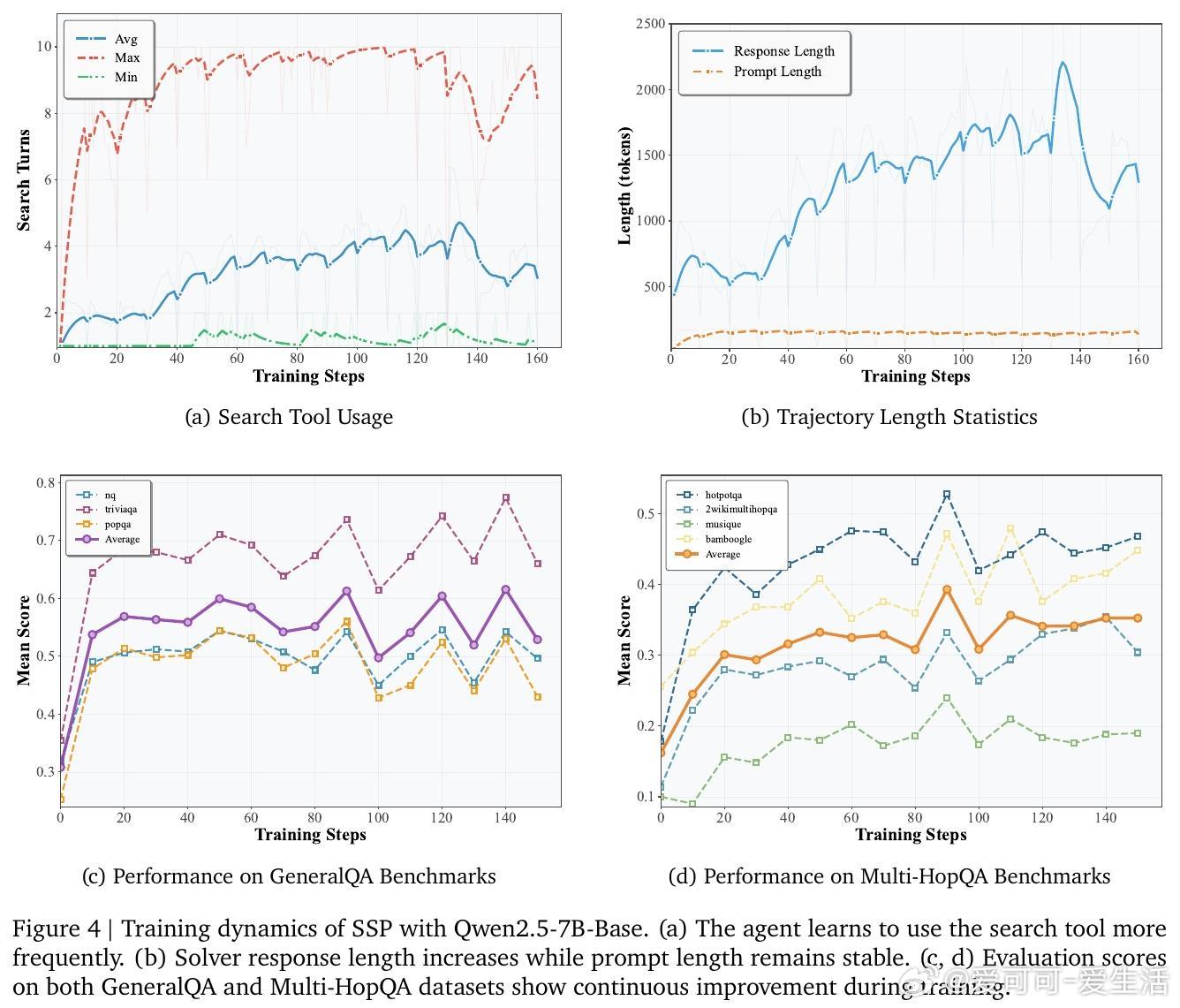 消融实验强调共进化关键:仅训求解者(Solver-Only)导致过拟合,奖励饱和;仅训提出者(Proposer-Only)泛化差。完整SSP动态调整难度,训练中搜索调用次数和响应长度持续增长,性能稳定上升。RAG验证不可或缺,无它准确率降至36.7;噪声优化防“黑客”问题(如非唯一答案查询)。此外,RL算法对比显示REINFORCE+GRPO最佳,平衡效率与效果。