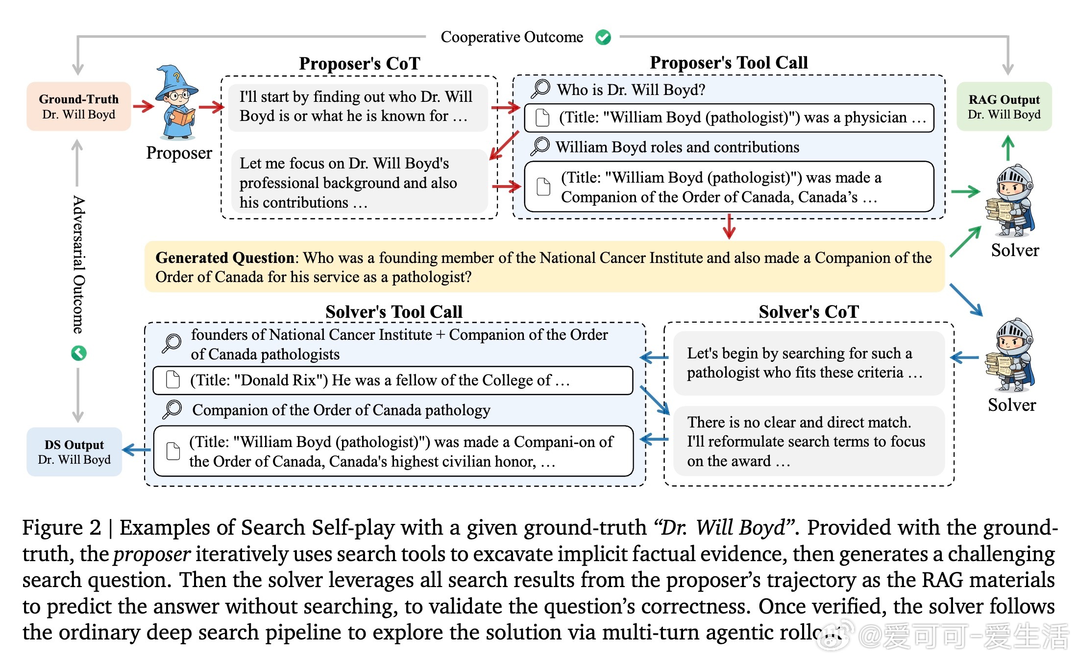 这种设计巧妙融合AlphaGo Zero的自博弈思想与代理工具交互,突破LLM内部知识局限。不同于传统自博弈(局限于数学/代码),SSP利用外部搜索工具,确保生成的查询真实且可验证,适用于复杂信息检索场景,如科学文献综述或事实核查。