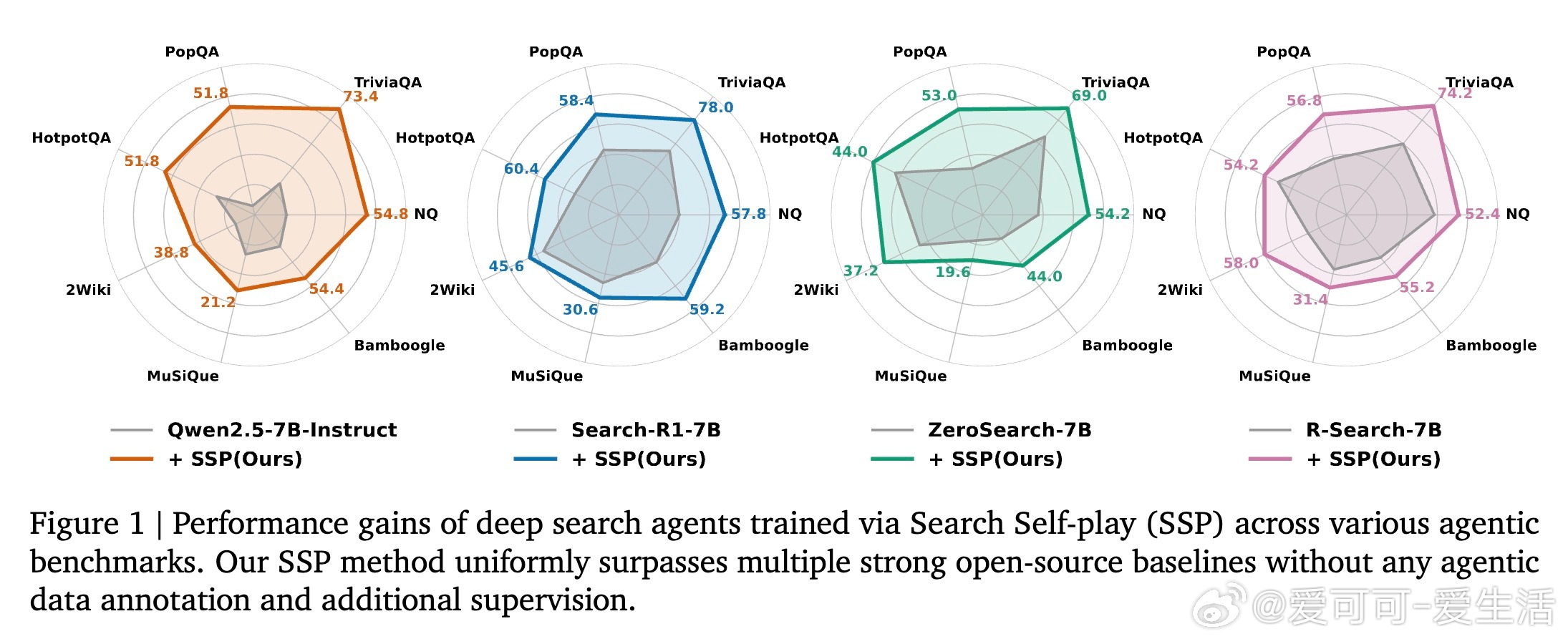 - 从零训练:在Qwen2.5-7B-Base上,SSP平均提升26.4分(TriviaQA +40.4);Instruct版提升8.0分。证明SSP能从基础模型中挖掘代理潜力。
