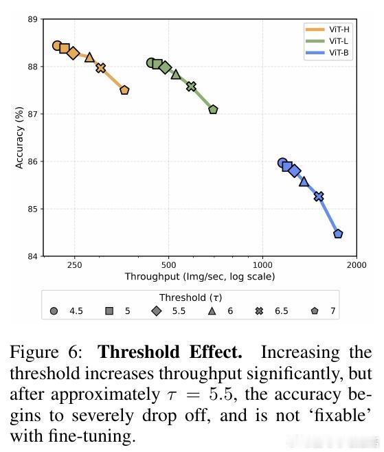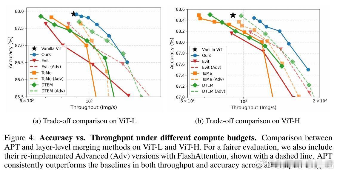 消融实验显示,零初始化MLP是关键,仅1 epoch即可“修复”性能;熵阈值τ=5.5是最佳权衡(更高阈值加速但准确掉落不可逆);无减token时APT有轻微开销,但实际减token后净加速20%以上。相比层级合并基线(如ToMe、EViT),APT在吞吐-准确图上全面领先,尤其在大模型和高分辨率场景。