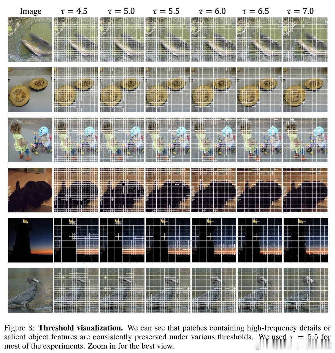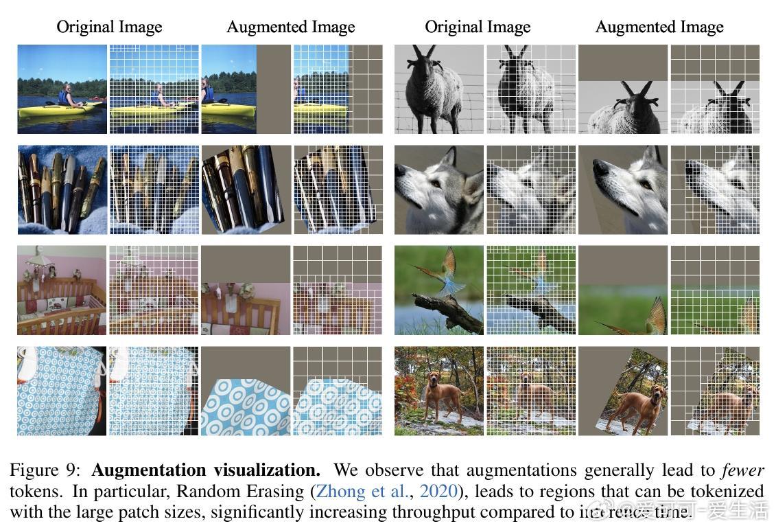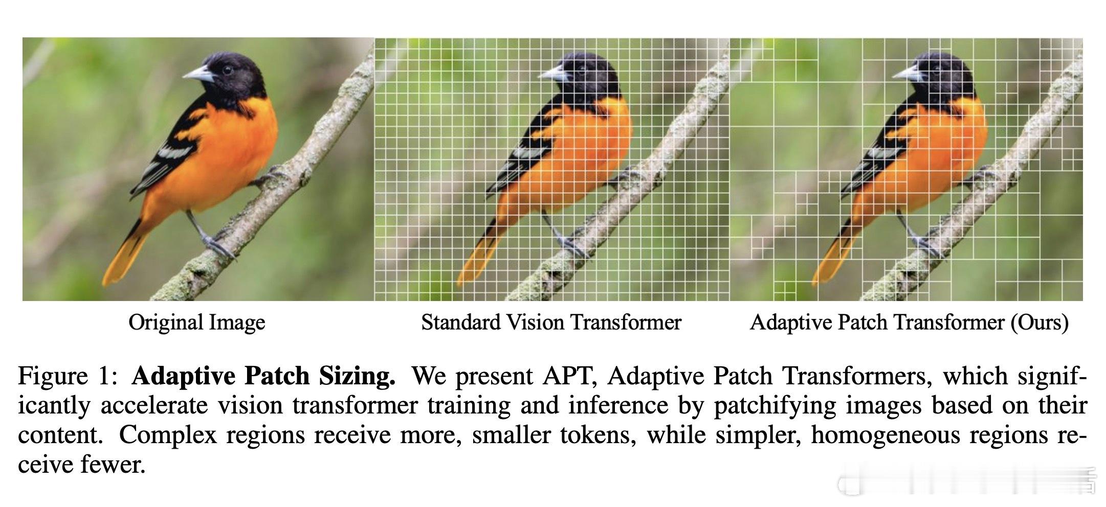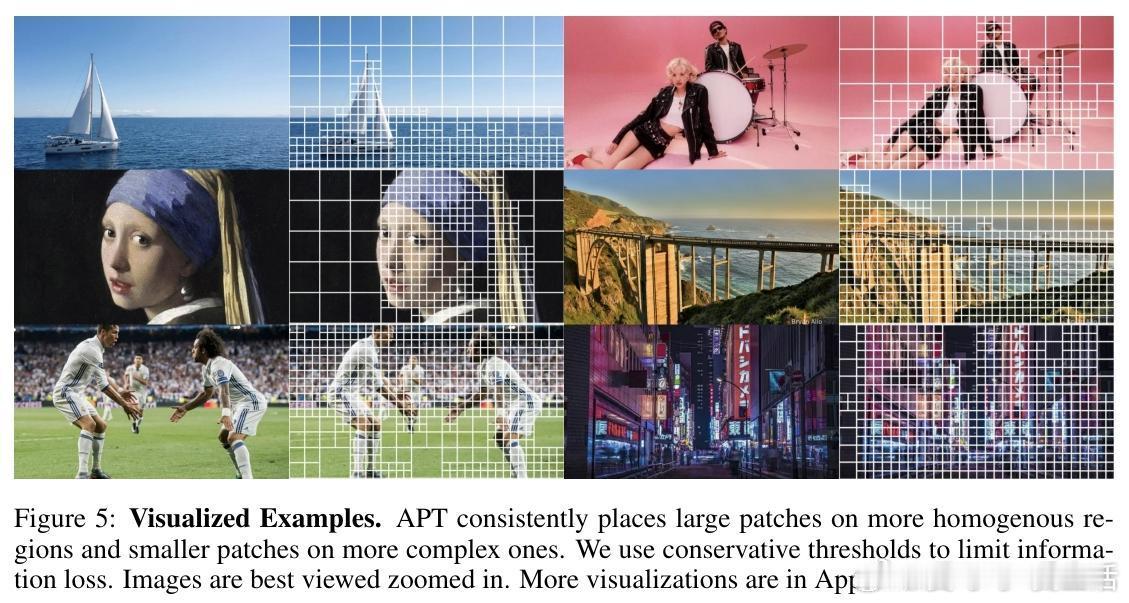 可视化示例中,APT智能地将大补丁置于均匀背景(如蓝天、暗影),小补丁用于焦点物体(如鸟头或城市细节),图像复杂度决定总补丁数。这不仅高效,还在数据增强(如随机擦除)下进一步加速训练。