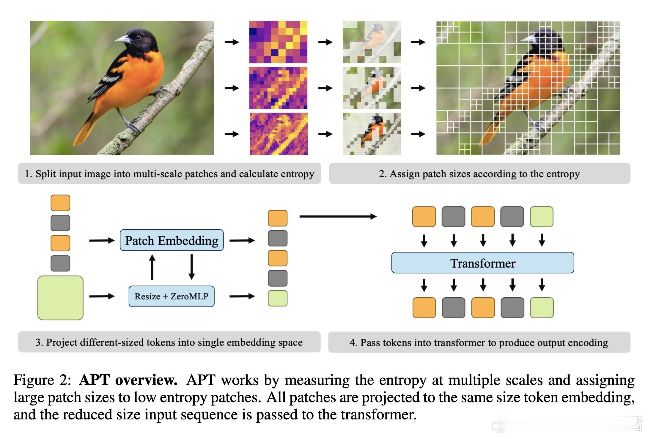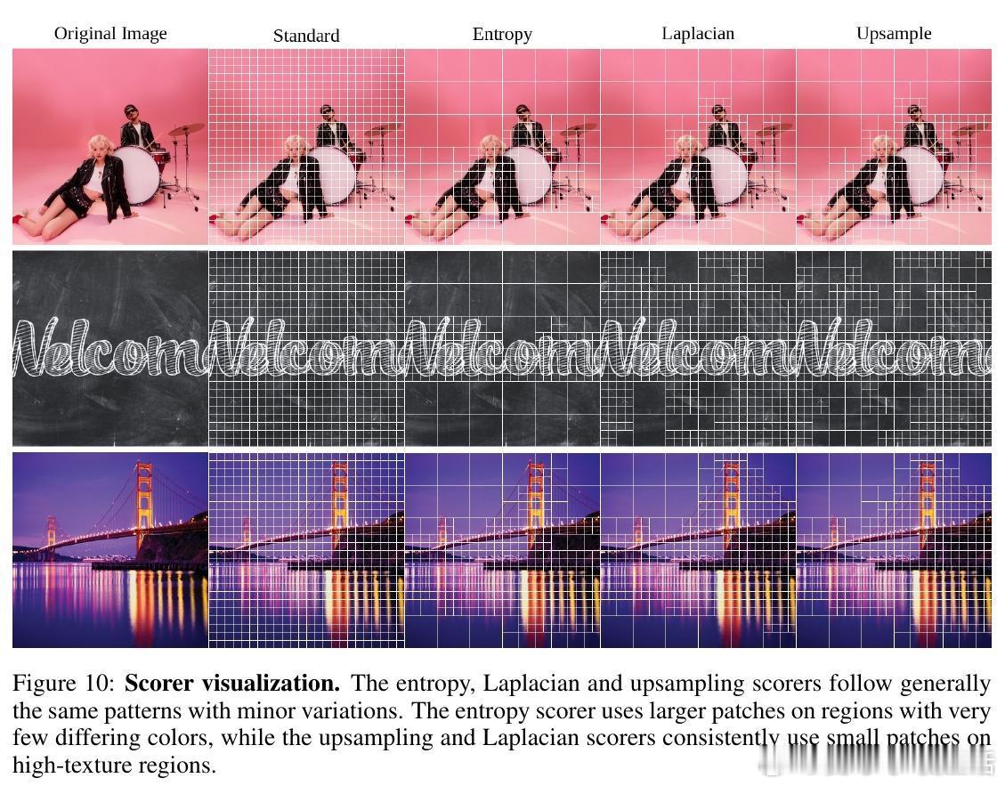 APT的关键洞见是:图像并非处处复杂。简单区域(如纯色背景)冗余高,可用大补丁表示;细节丰富的区域(如人脸或物体边缘)需小补丁保留信息。方法采用分层熵计算(entropy)作为度量:熵低(低信息量、高冗余)的区域分配更大补丁(如16x16扩展到64x64),从而减少总token数。