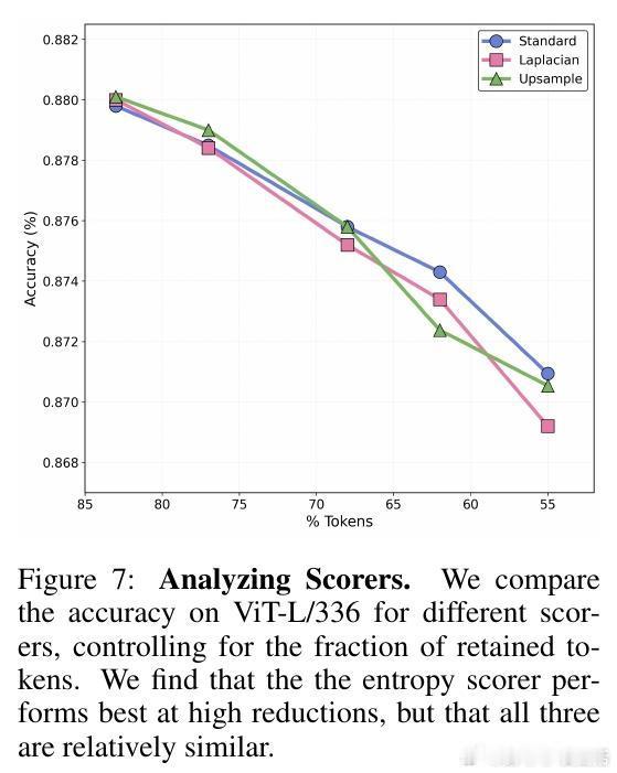 - VQA(LLaVA模型):视觉token减23%,整体吞吐提升22%-26%,在VQAv2、GQA等基准上匹配或超基线(e.g., LLaVA-13B准确率从80.0%升至79.4%,但速度更快)。