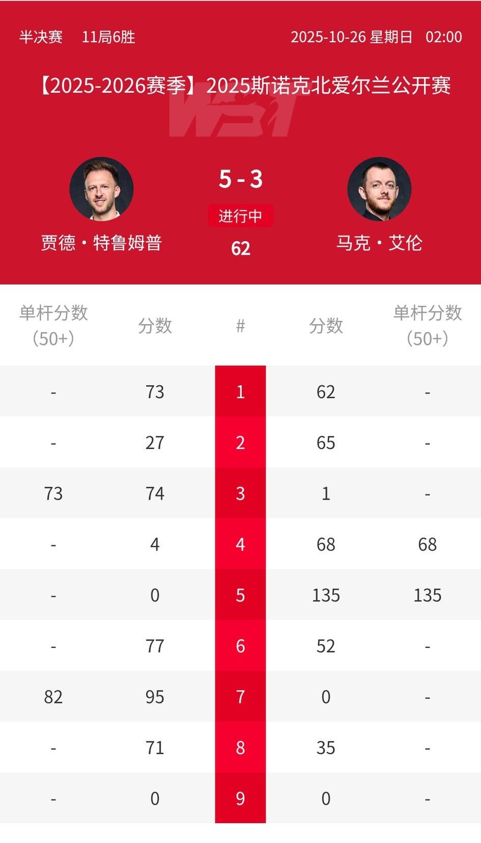 2025斯诺克北爱尔兰公开赛半决赛,特鲁姆普要起飞了! 第六局,一杆几乎无解的斯诺克,帮助小特扳平比分,3-3。 接着小特又连胜两局,5-3拿到赛点。不过艾伦不到赛点不会打球,被他逆转的比赛本赛季太多了。