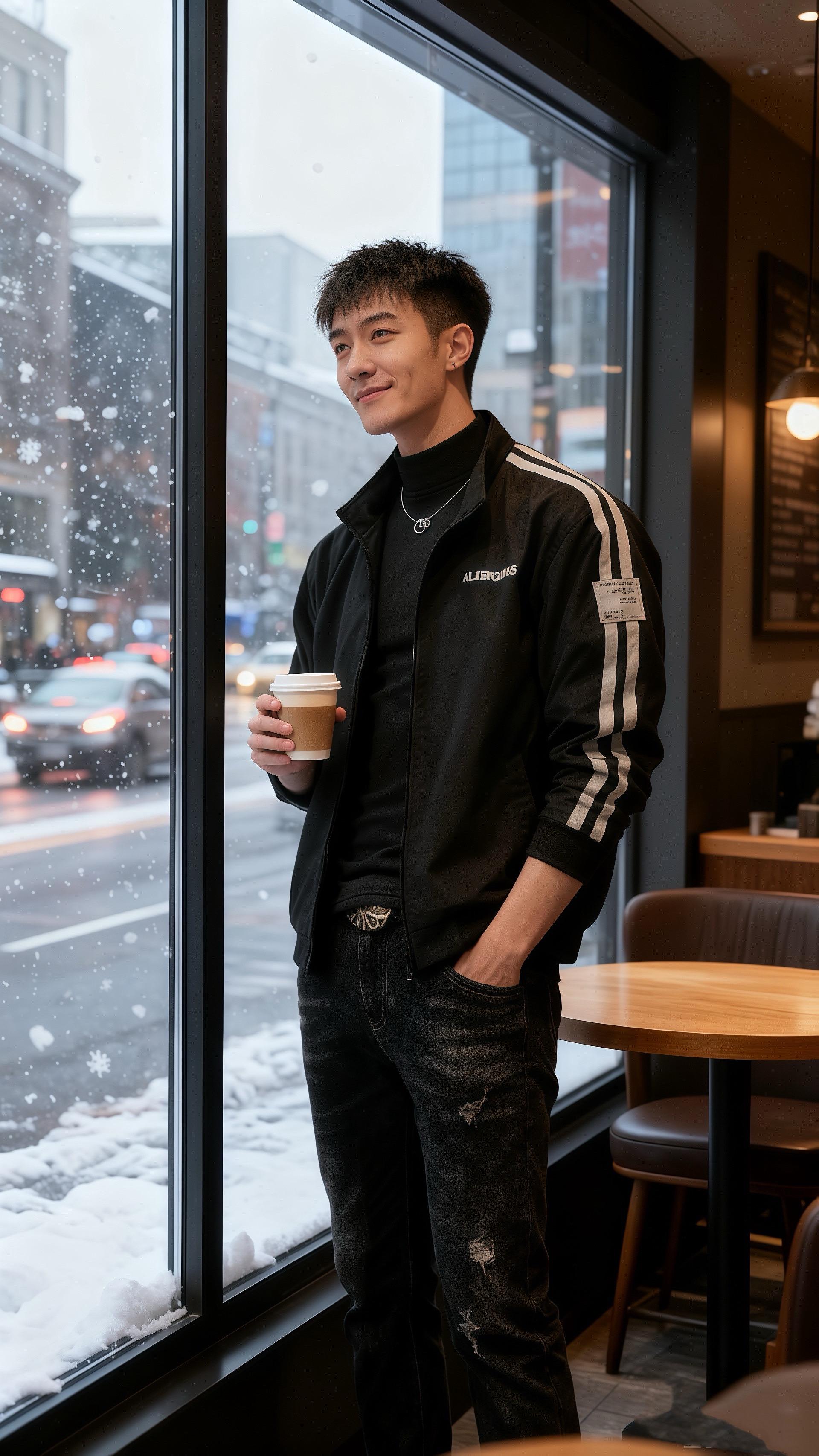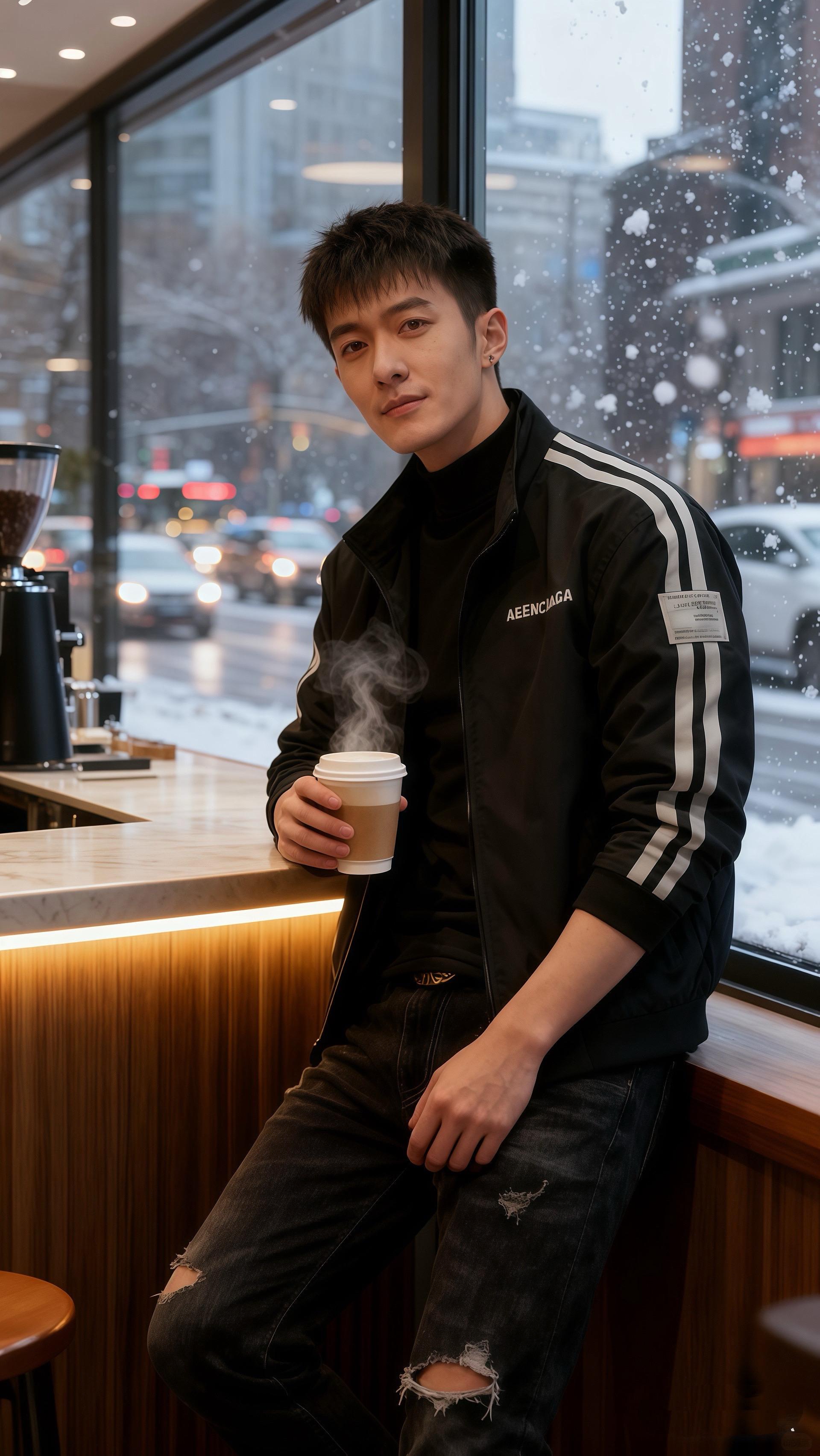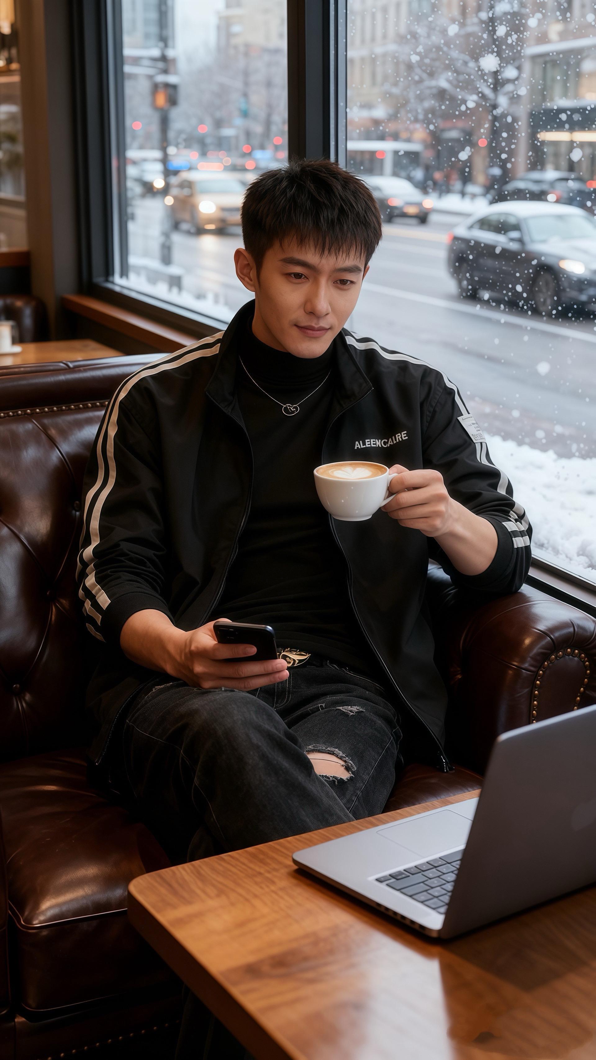 雪粒子敲着咖啡店的玻璃窗,许妍推开门时,先看见皓明窝在皮沙发里——黑色夹克的白边衬得肩线利落,破洞牛仔裹着松弛的腰线,指尖捏着咖啡杯,雾汽漫过他垂着的眼睫。