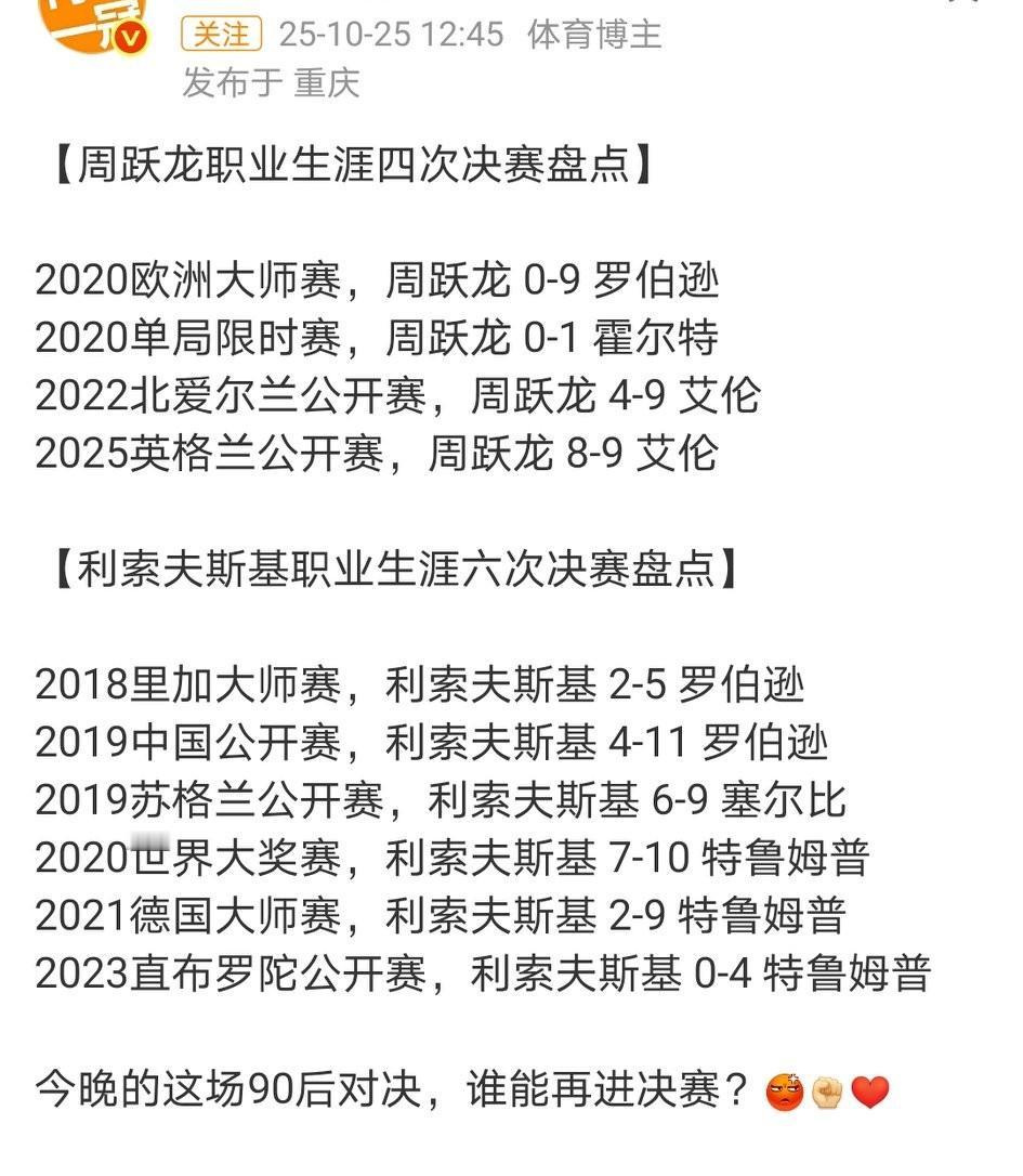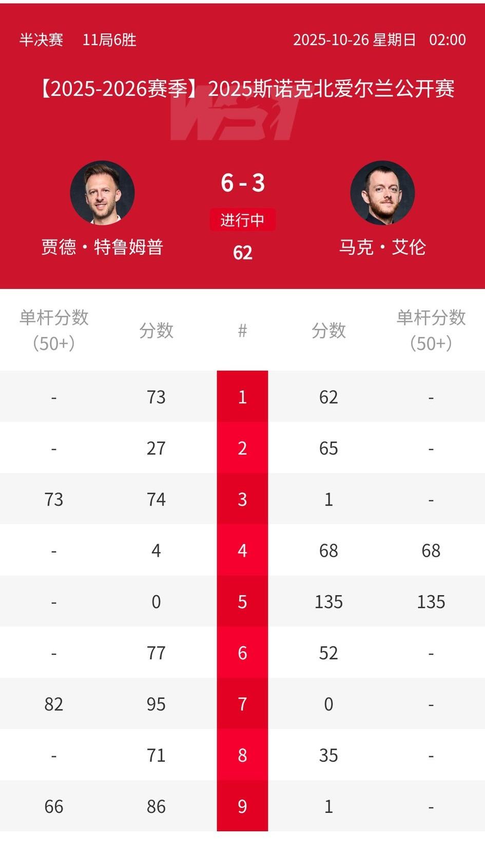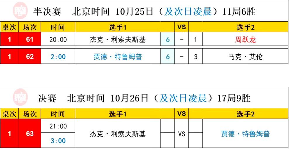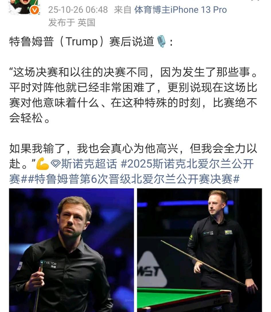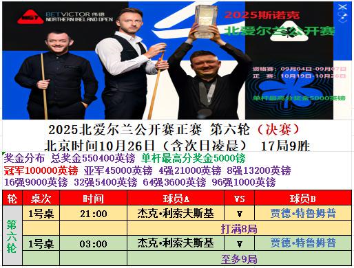 这对好基友决赛又相见了!小司机最近三次决赛失利都是拜特鲁姆普所赐。2025斯诺克北爱尔兰赛半决赛结束,利索夫斯基、特鲁姆普会师决赛。晋级决赛后特鲁姆普说挺愿意看到好朋友夺冠(图六)。 利索夫斯基6-2周跃龙 特鲁姆普6-3马克艾伦