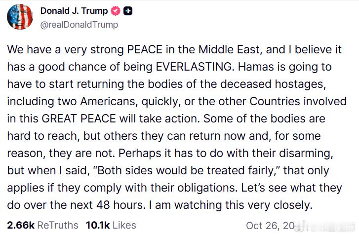 我们在中东已经建立起非常稳固的和平,我相信这次的和平有很大机会成为永久的和平。哈马斯必须尽快开始归还人质遗体,其中包括两名美国人,否则参与这项伟大和平的其他国家将会采取行动。有些遗体确实难以找回,但也有一些他们现在就能归还——然而出于某种原因,他们并没有这么做。也许这与他们的解除武装有关。不过,当我说“双方都会被公平对待”时,那只适用于他们履行自身义务的情况下。让我们看看接下来的48小时他们会怎么做。我正在密切关注这一切。