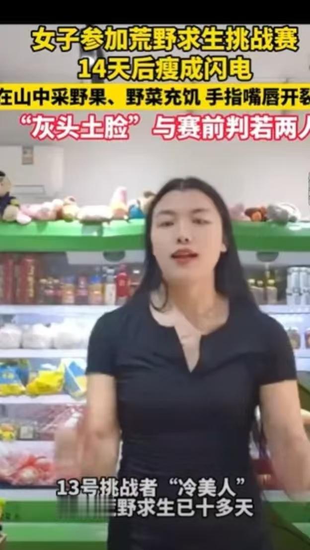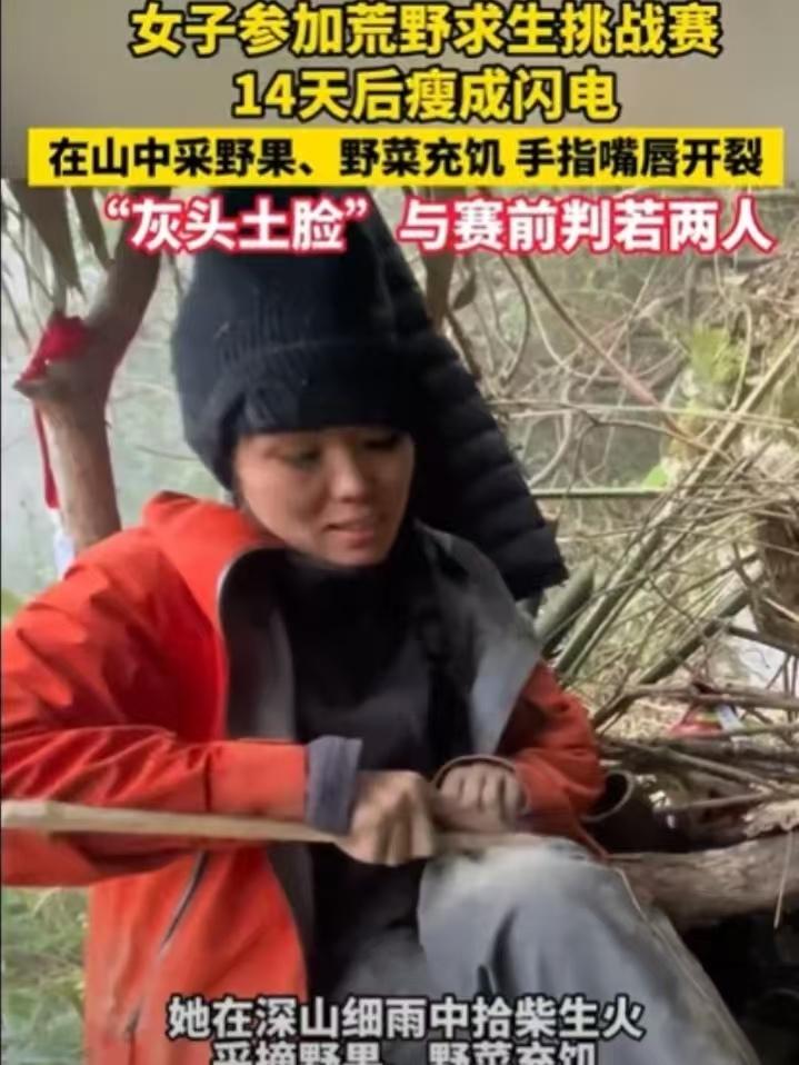为了钱连命都不要了,该说这女人傻还是聪明?湖南一女子参加为了20万奖金,竟然去参加荒野求生,本来还算丰韵的她,仅仅14天就瘦成一道闪电,嘴唇手指裂开,截止目前还有25人在挑战,总人数100人,她也是目前唯一一位女性挑战者。 据悉,挑战者凭一把柴刀参与挑战,挑战到最后一位有20万元奖金。看她瘦了这么多,很明显就是饿出来的,也就是找不到东西吃!山里又冷又湿,又没镜子,基本都不会注意个人形象了,都是在熬,看谁熬的久,熬到对手退赛,十几天就剩她一个女选手了! 有人把航拍图发到网上,配文“为20万奖金,湖南大姐荒野求生14天,瘦成闪电”,一下就火了。但是网友对此却两极分化,20万虽多,把身体搞垮了咋整”,也有说她勇的,一个女人家,比好多男人都能扛”。 这14天饿出的胃病、累垮的身子,后期花的钱可能比奖金还多,图啥啊!要知道,没专业装备的荒野求生就是赌命!更何况是一把柴刀,长期饥饿会导致肌肉流失、器官功能下降,她手指裂口不处理,万一感染引发败血症就危险了; 山泉水看着干净,可能有寄生虫,没烧开喝容易闹肚子,脱水加感染,分分钟出人命。这不是“勇敢”,是拿命赌。二十万确实诱人,但若是身体除了毛病,命要是没了,就啥都没了。 我身边有个亲戚,之前为了多挣加班费,连续半个月天天熬夜加班,最后突发急性肠胃炎住院,光治疗费就花了小一万,还耽误了大半个月没法上班,算下来根本得不偿失。 这大姐跟我那亲戚有点像,都是盯着眼前的钱,没算明白健康这笔账。20万看着不少,可真要是把身体熬出个好歹,后续治病、休养的钱可能得把奖金全搭进去,说不定还不够,到时候钱没落下,身体还垮了,那才是真亏。 现在还剩25个人在熬,她作为唯一的女选手,能撑到现在确实够能扛,但扛得越久,身体受的损伤就越大。真要是为了这20万把命搭进去,或者落下一辈子的病根,再后悔可就晚了。钱没了能再挣,命没了可就啥都没了,你说这到底值不值?各位读者你们怎么看?欢迎在评论区讨论。