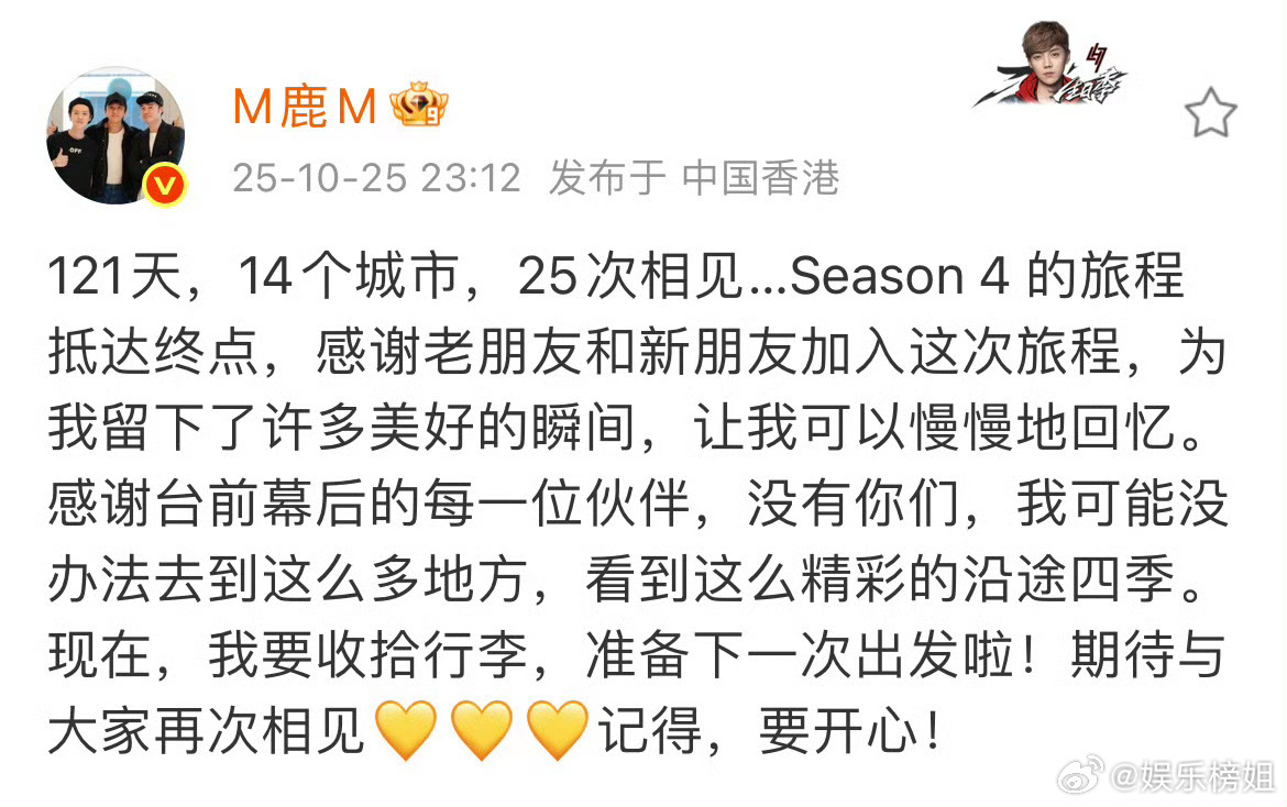 鹿晗四巡收官文鹿晗四巡121天,14个城市,25次相见…Season 4 的旅程抵达终点了🔚感谢穿越者🦌和好朋友们的一路相伴,期待下一次见面[捂嘴哭] 记得,要开心💛 我们五巡见💛鹿晗season4亚洲巡演