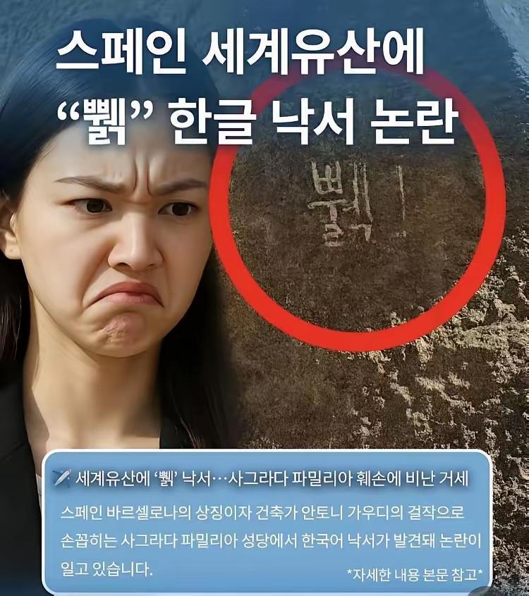韩国游客在景点涂鸦,被抓后,毫不犹豫地甩锅给中国人 西班牙圣家堂这世界级遗产,愣是被韩国游客的涂鸦添了“败笔”,挨骂没素质本是咎由自取。 韩网友的操作绝了,一句“写韩语的可能是中国人”,把甩锅玩得比涂鸦还熟练。 我们都知道,这属于韩国人的日常操作:自己人干了丢人事,先想着把黑锅扣给别人。 尤其喜欢往中国人身上推?之前偷文化时说韩语多伟大,这会儿倒嫌韩语太好认,急着切割关系。 有时候我们也挺难受,怎么就和这种东西做了邻居?太膈应了! 韩国偷文化真相 韩国景点真相 上海韩国游客 韩国偷文化翻车