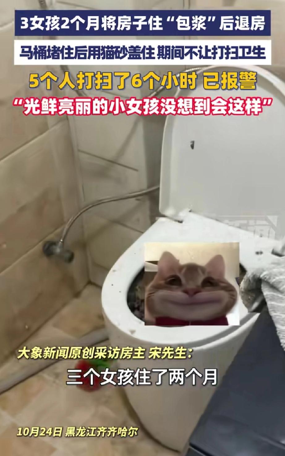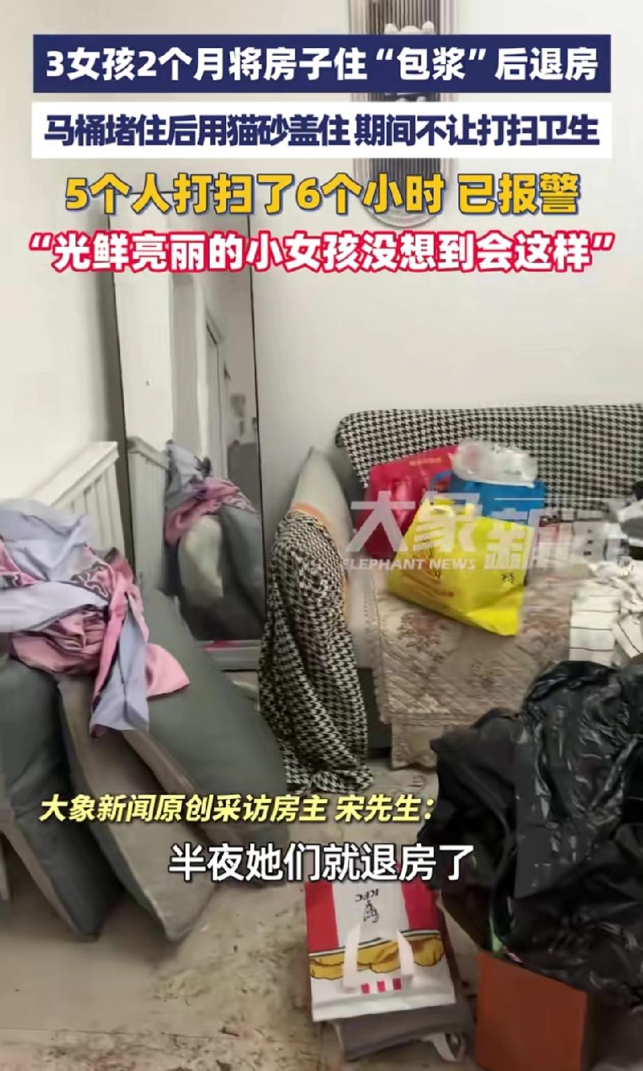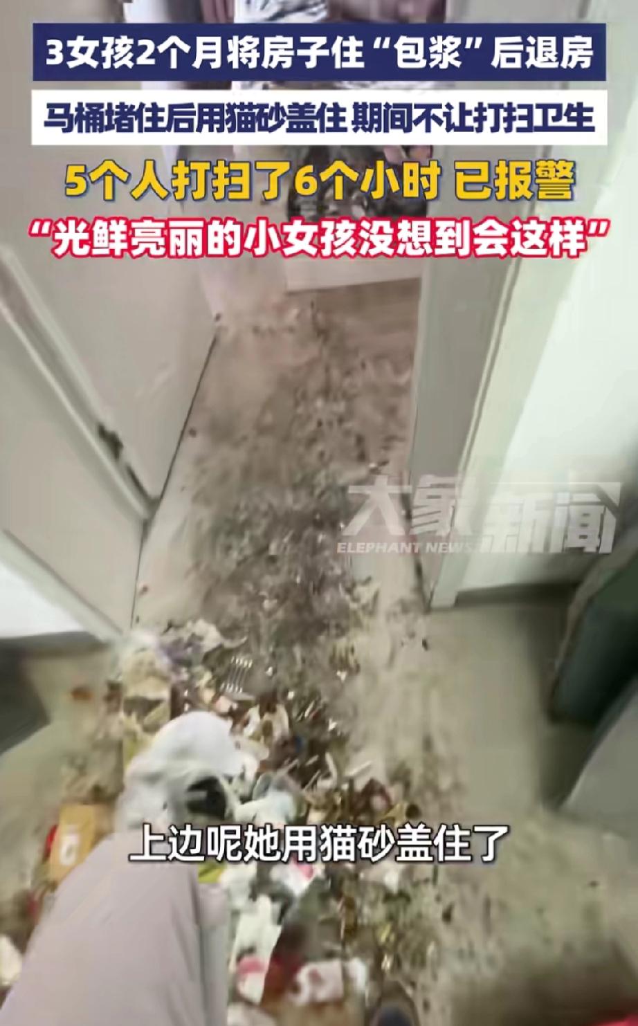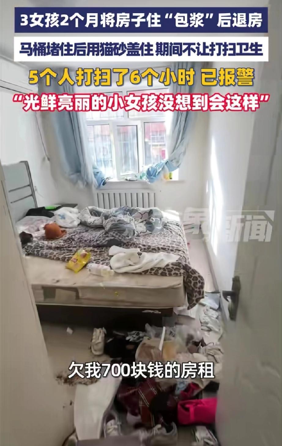 黑龙江,有三个女孩租了两个月房,半夜突然通知房东要退房,还拖欠了700元房租。 清晨,房东去验房,一推开门,一股刺鼻臭味扑面而来。地面污秽至极,走廊和卧室里堆满了垃圾,床上还堆着散发异味、如同“包浆”般的被子。 走进卫生间,只见马桶堵塞,里面积满了粪便。 更让人难以接受的是,房东发现了一盆猫砂,收拾时才惊觉,她们竟把大便拉到猫砂盆里,再用猫砂掩盖。 这可是刚装修不久的房子,看到房子被糟蹋成这副模样,房东气愤不已。 看着外表光鲜亮丽的三个女孩,实在难以想象她们竟如此不讲卫生,把房子搞得面目全非,于是直接报了警。 房东和四个朋友花了6个小时打扫,其中有2个小时用来呕吐。 有当地网友心有余悸地评论:我儿子前天打电话说找了个对象,那女孩退了租的房子,已经搬到我儿子那儿住了,不会就是她们其中一个吧? 有网友评论:这就是孩子少,家长过分溺爱导致的结果。 还有网友评论:见过不爱干净的,可没见过把出租屋祸害成这样的! 房子是租来的,但生活不是。把房东的房子搞得脏兮兮,是对他人财产的不尊重,更是对自己生活的敷衍。污渍能擦掉,可丢掉的责任感,再难捡回来。 租房不是“制造垃圾场”,别让一时的懒惰,换来赔偿时的懊悔,还要为破坏行为付出代价。 这事也给做家长的提个醒,教会孩子做家务的必要性!不仅能让他们把自己的生活打理干净,更能懂得尊重他人空间,避免给别人添麻烦。 来源:大象新闻