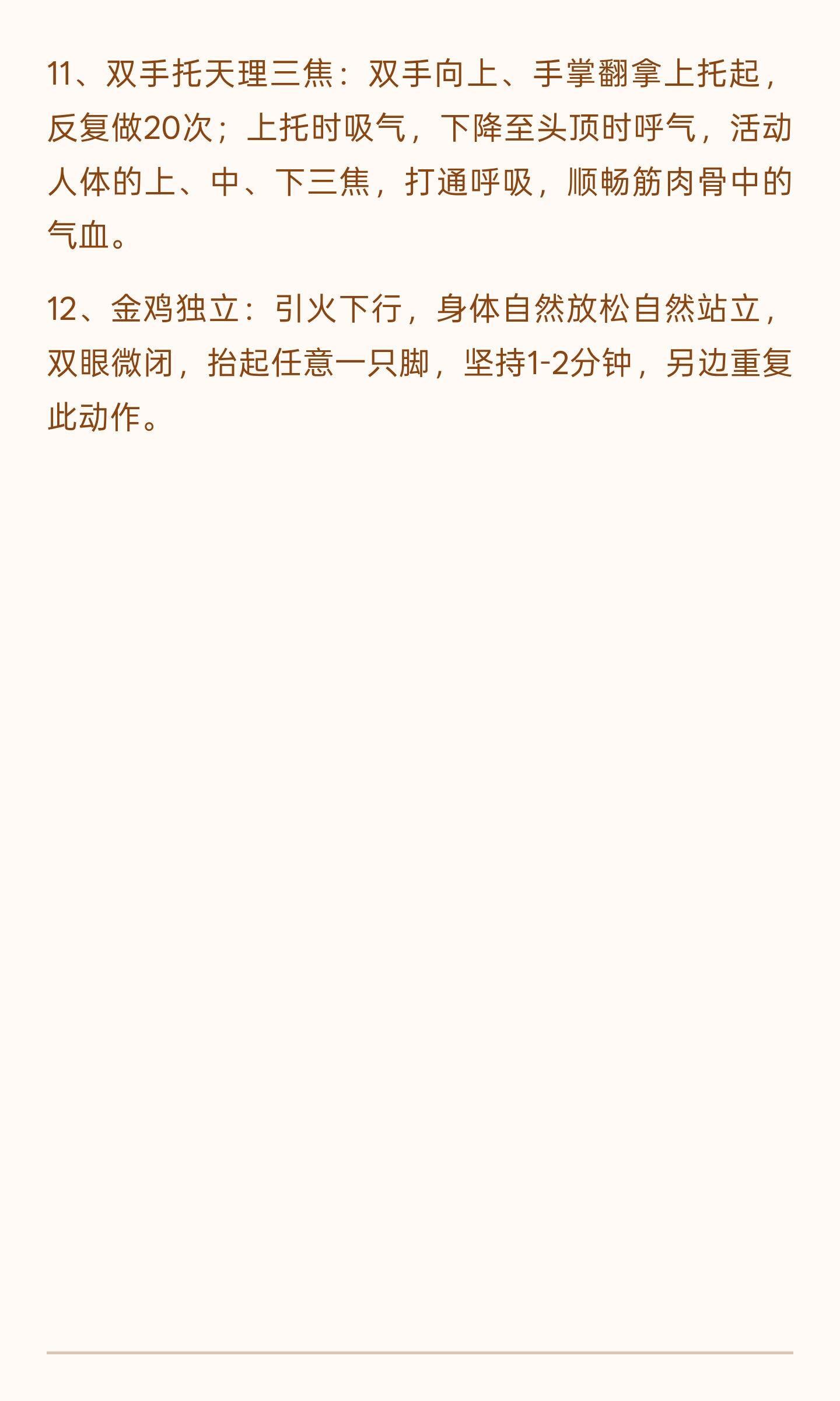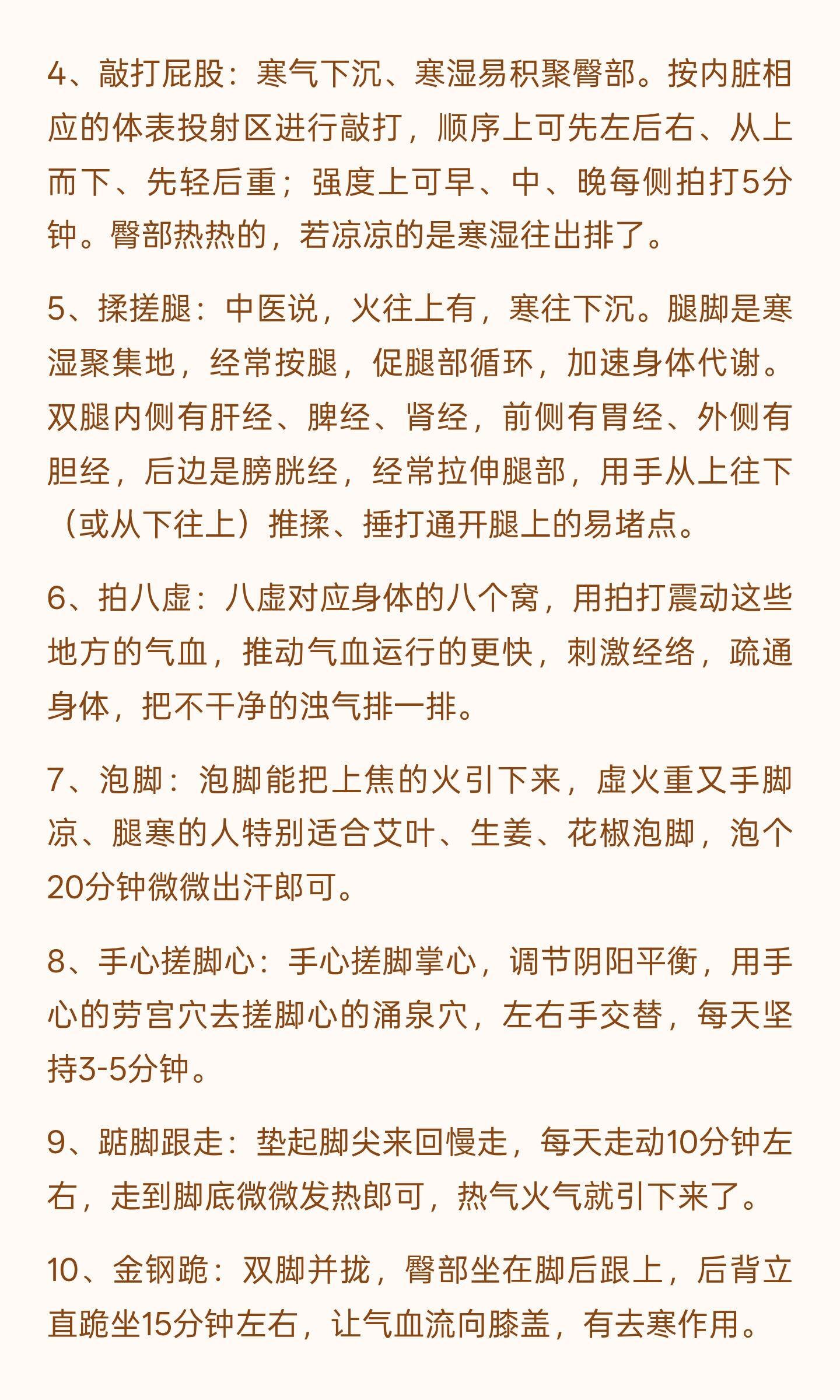 12个打通中焦的方式通过艾灸、热水袋、按摩、敲打带脉、拍打臀部、揉搓腿部、泡脚、手心搓脚心、踮脚跟走、金钢跪、双手托天理三焦和金鸡独立等方法,促进血液循环,排出寒湿,激活代谢,帮助减少脂肪堆积,改善身体循环和消化功能。养生女人保养经络中医养生养脾胃健康养生