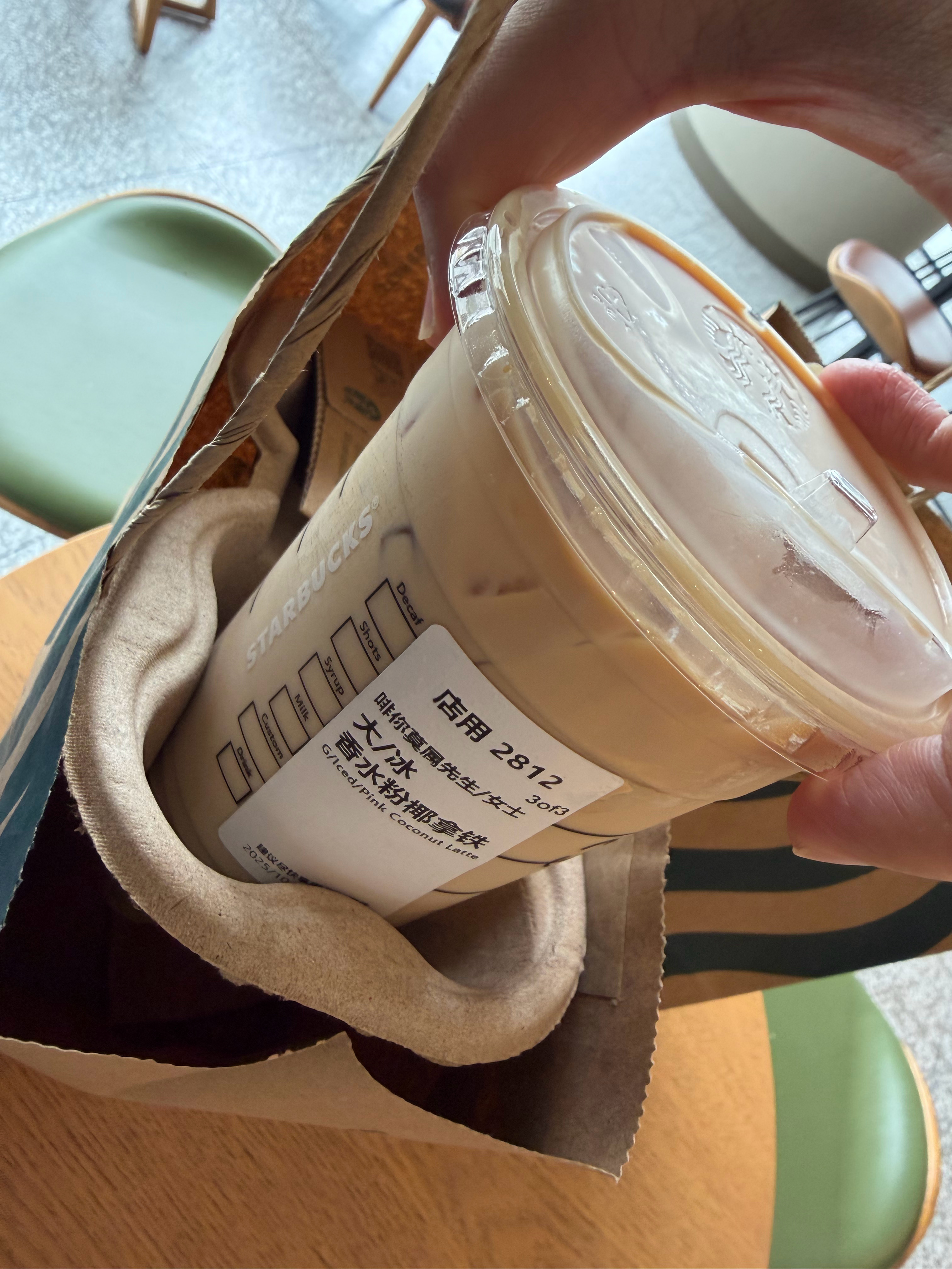 今天也是好上了,喝上星巴克香水粉椰拿铁,味道不错!今日份开心~[二哈]