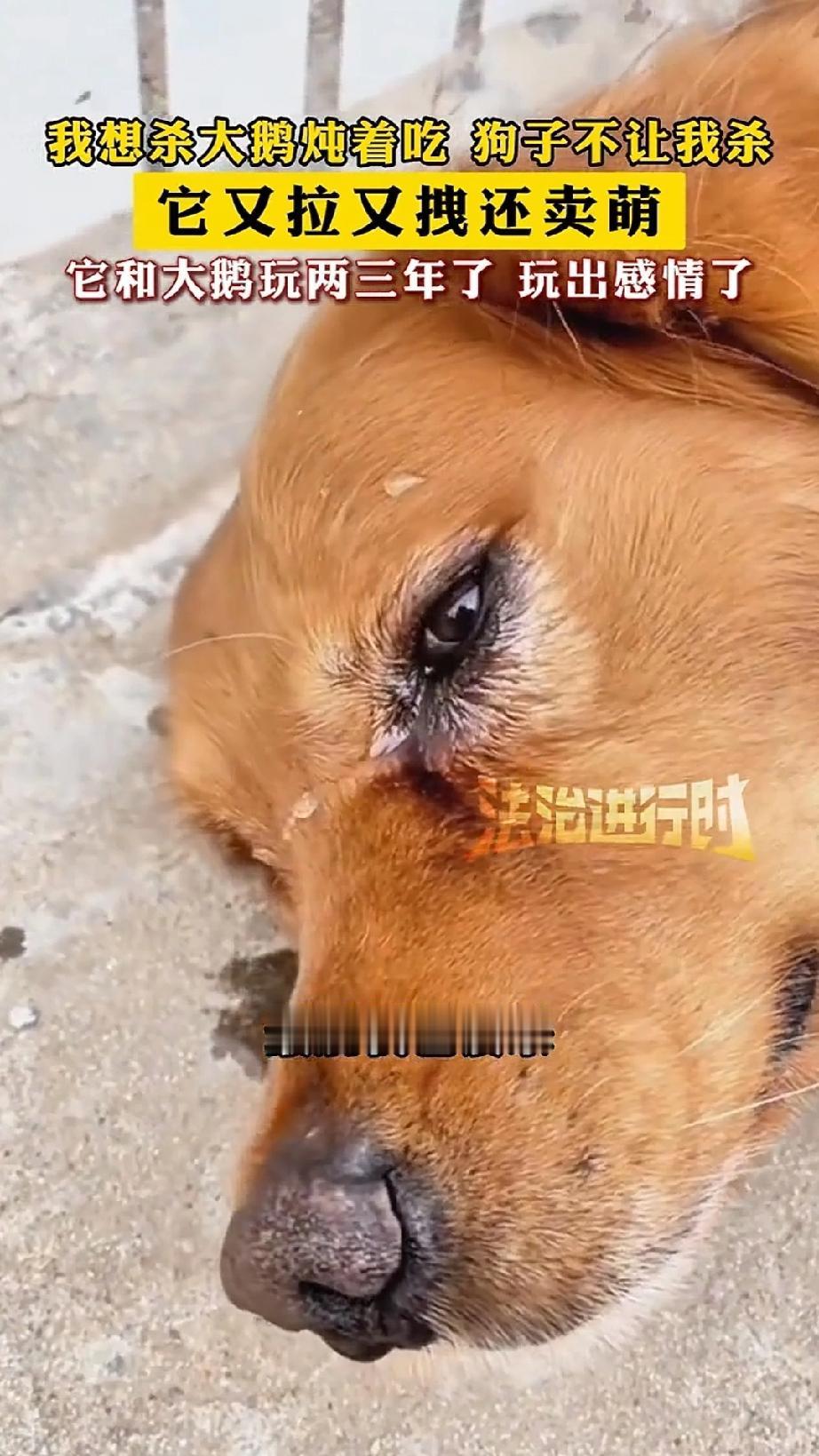狗子拦住主人,不让其宰杀大鹅,又是拉拽,又是卖萌,大鹅最终幸免于难,而狗子却躺在