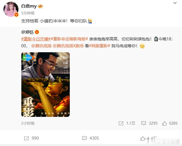 白鹿转发支持郑恺新剧 白鹿转发支持郑恺新剧《重影》,真不愧是咱们的宣传小能手呀,跑男的友情真的是太真诚了!一起来为咱们大哥的剧打call 白鹿给郑恺新剧打call