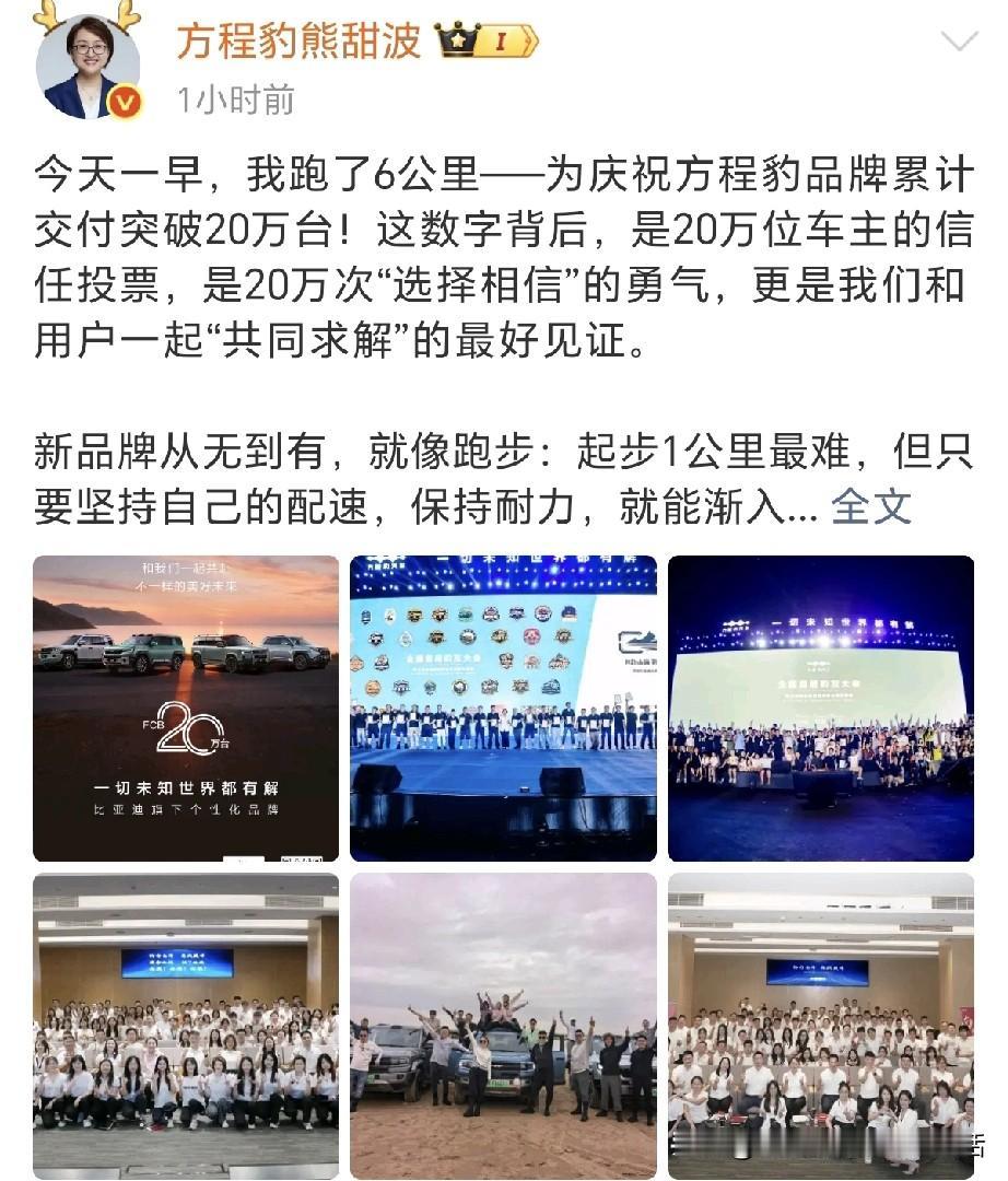 王传福低调了! 要不是方程豹熊甜波说出来,大家都还蒙在鼓里,方程豹汽车20万台销量达成,新势力品牌增速TOP3,品牌平均成交价23.88万!大家要知道这是才2周年的方程豹,友商一看一个不吱声,现在肠子都悔青了,万万没想到啊,方程豹成了比亚迪的扛把子! 方程豹熊甜波表示今天太高兴了,今天一早,我跑了6公里——为庆祝方程豹品牌累计交付突破20万台! 10月20日豹5长续航版全新上市, 10月26日钛3上市! 9月份钛7上市,上市首月交付11674台! 方程豹汽车9月销售24121辆,环比增长48.3%,同比增长344.9%,月销量突破20000辆! 今天方程豹累计销售突破20万辆! 腾势有赵长江,方程豹有熊甜波,方程豹在熊甜波的带领下从无到有,短短两年时间,方程豹就推出了智能越野的豹系列和城市全能的钛系列,“可城可野”、“智能硬核”,给用户带来了新的生活方式!获得了超多用户的认可! 熊甜波说:明年,我们还会带来轿车系列,继续用科技拓展出行的边界,让更多个性的梦想照进现实! 为方程豹点赞!为比亚迪点赞!